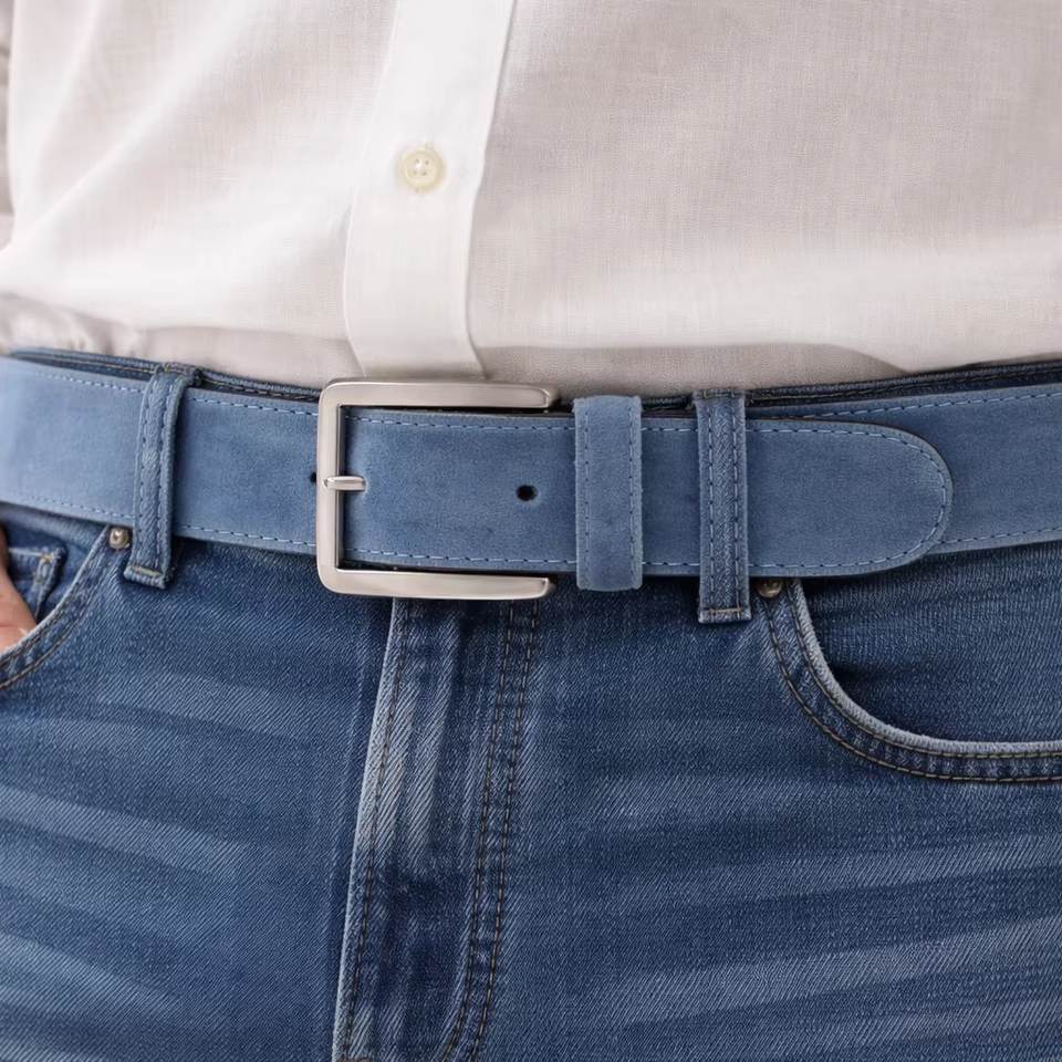 เข็มขัดหนังแท้ผู้ชาย | ผิวสัมผัสหนังกลับสีน้ำเงินพรีเมียม | หัวเข็มขัดแบบคลาสสิก | ผู้ผลิตและจำหน่ายสินค้า OEM แบบขายส่ง | ดีไวน์ อินเตอร์เนชั่นแนล