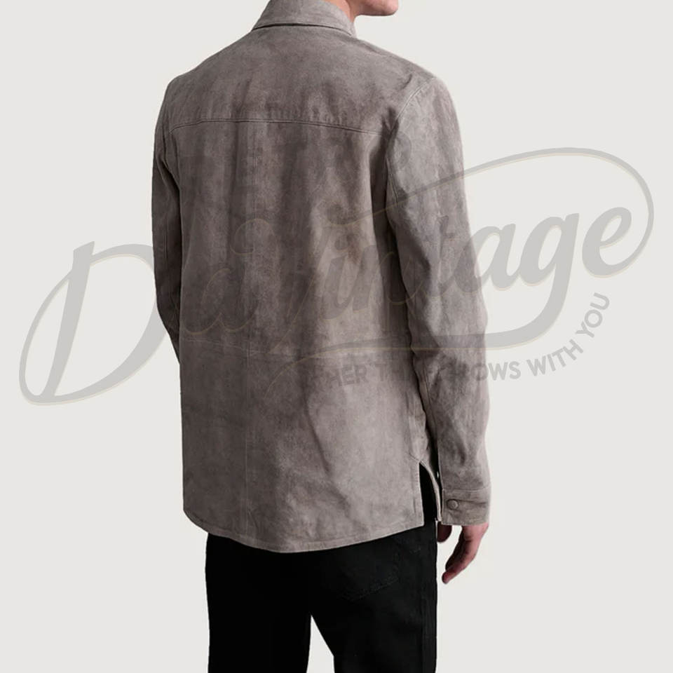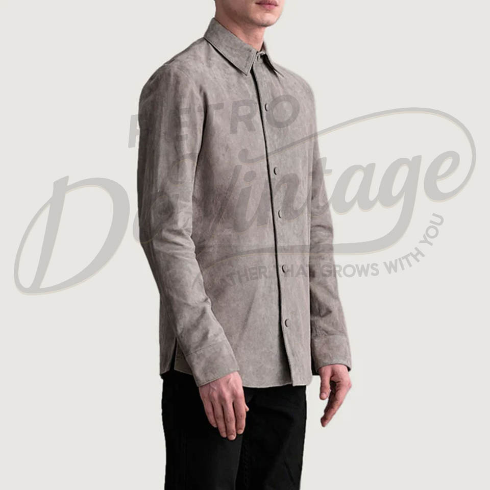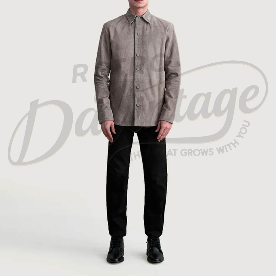 เสื้อแจ็คเก็ตหนังกลับแท้สีเทาสำหรับผู้ชาย ทรงคลาสสิก ติดกระดุม ทรงเข้ารูป สัมผัสนุ่ม สวมใส่สบาย เสื้อคลุมลำลองคุณภาพพรีเมียม