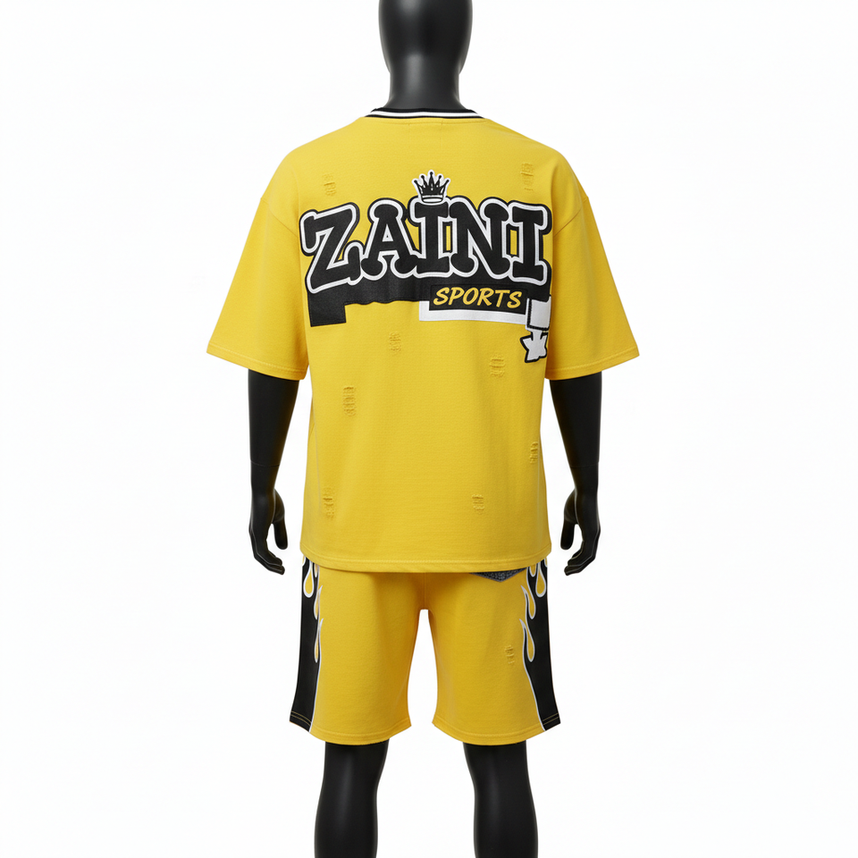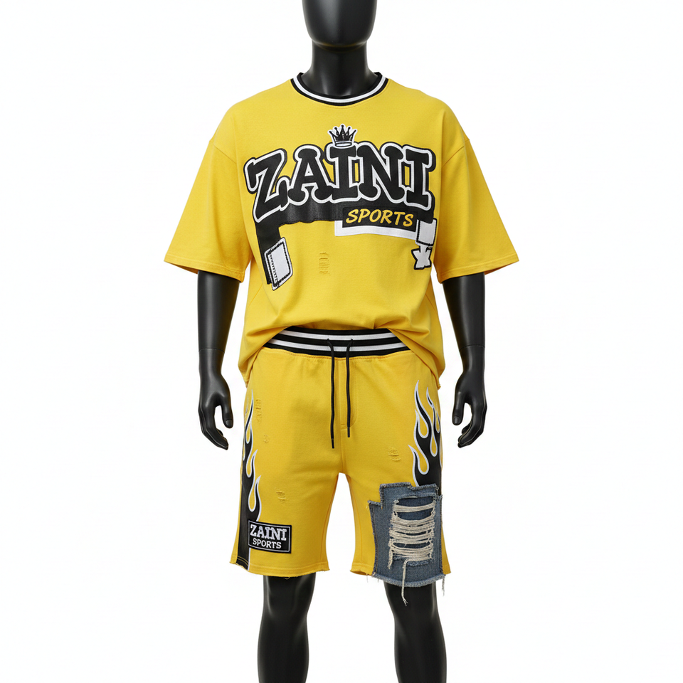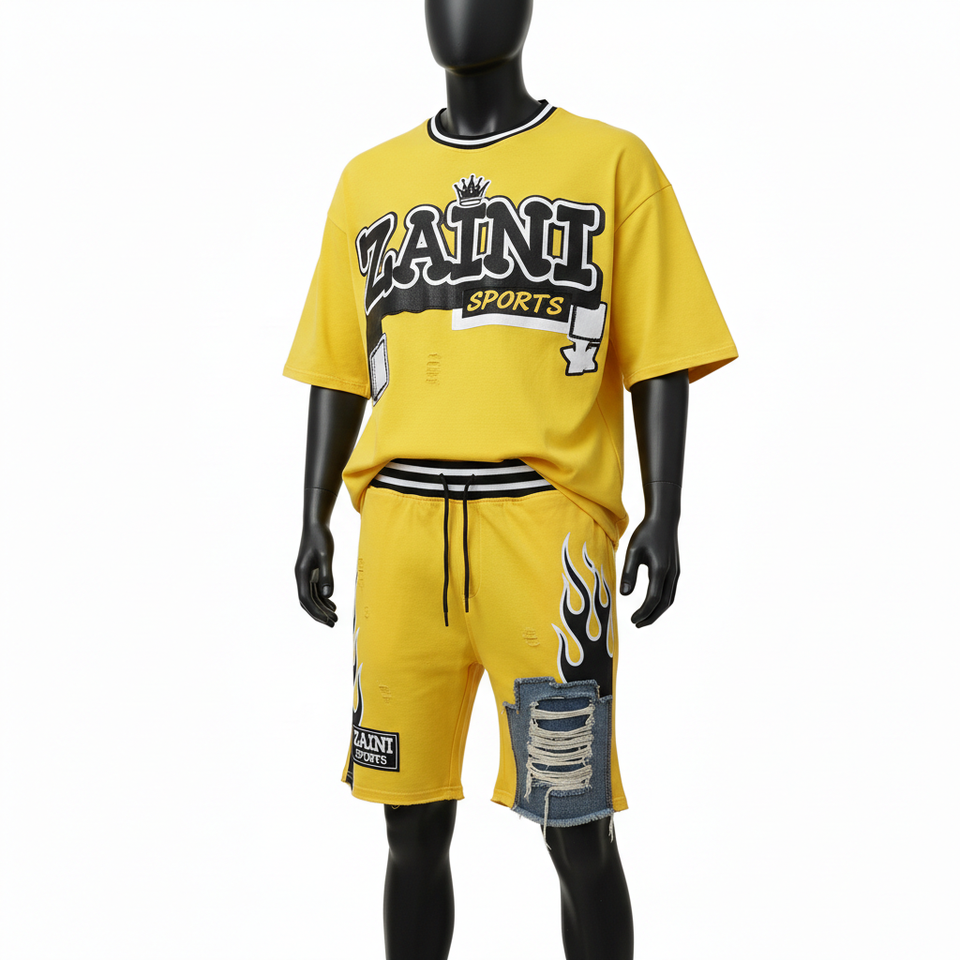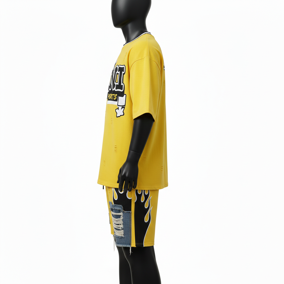 ชุดเสื้อยืดและกางเกงขาสั้นผู้ชาย ผ้าคอตตอนเจอร์ซีย์คุณภาพสูง เนื้อผ้าถักหนา ลายเปลวไฟสีเหลือง กางเกงขาสั้นแบบมีแผ่นผ้า รับสกรีนโลโก้