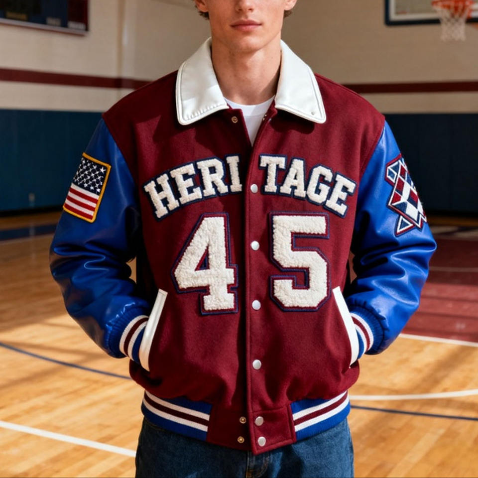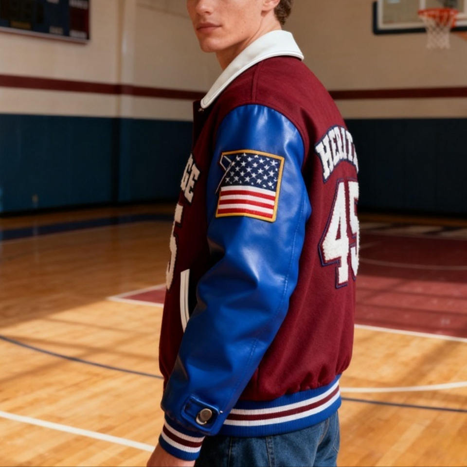 เสื้อแจ็คเก็ตวาร์ซิตี้ผู้ชาย แบรนด์ Men High Street ผ้าขนสัตว์ หนัง ปักอักษร ปักลายเชนิลล์ เสื้อแจ็คเก็ตเบสบอลแบบสั่งทำ
