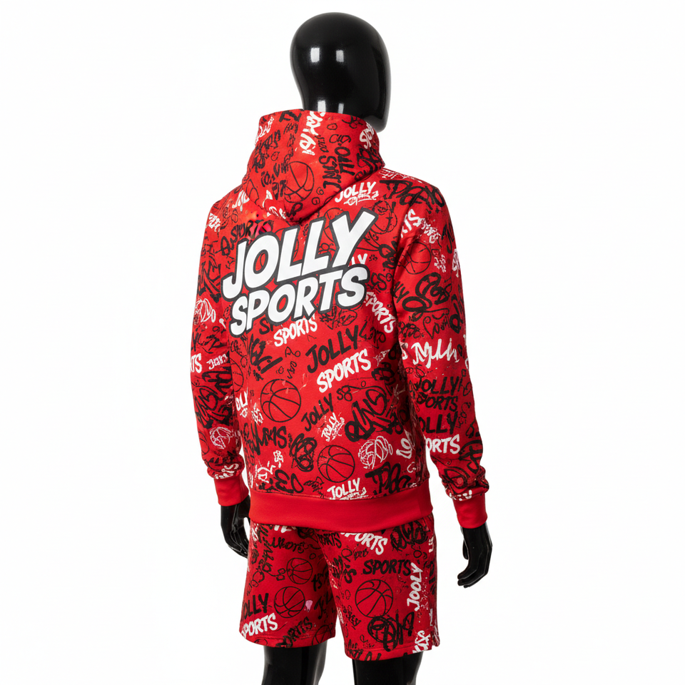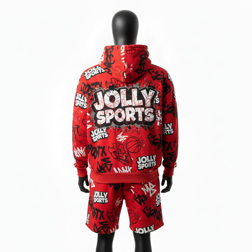 ชุดเซ็ตฮู้ดดี้และกางเกงขาสั้นผู้ชาย ผ้าฟลีซคุณภาพสูง 280 GSM สีแดง ขาว ดำ พิมพ์ลายทั้งตัว พร้อมสกรีนโลโก้ตามสั่ง