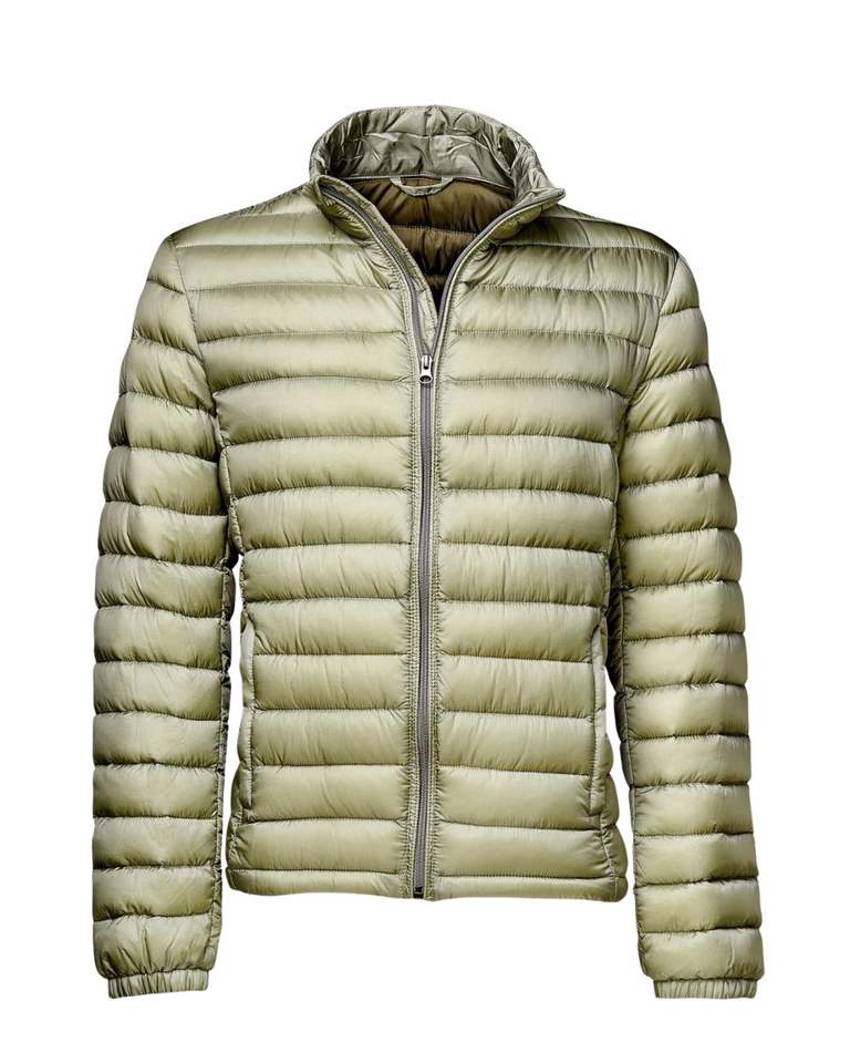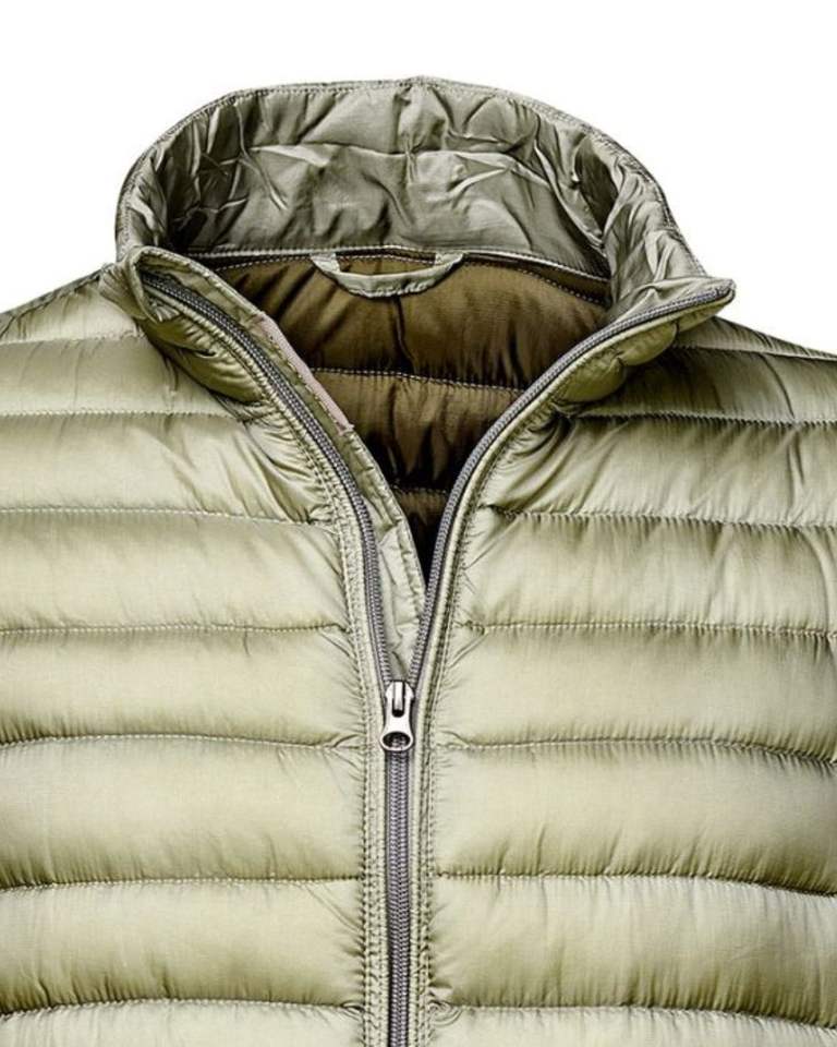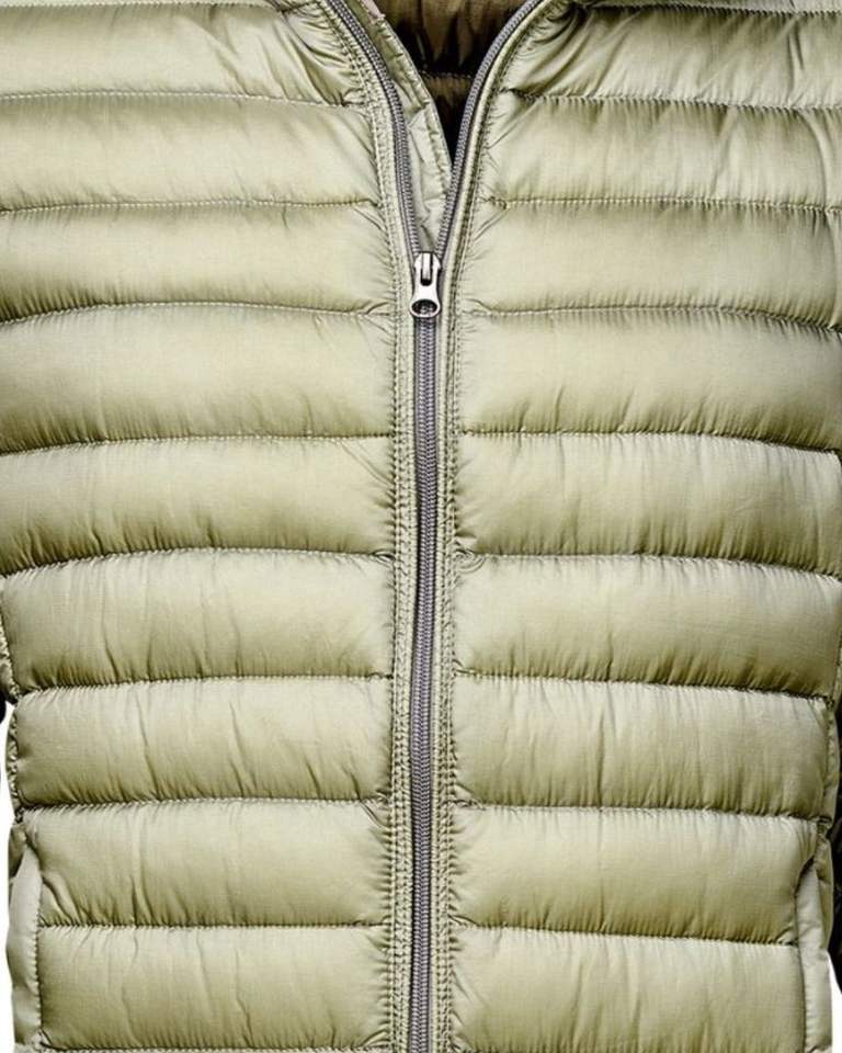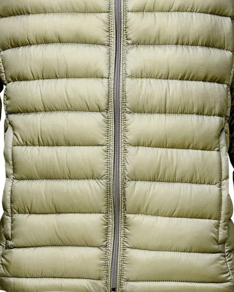 เสื้อแจ็คเก็ตพัฟเฟอร์สีเขียวมะกอกน้ำหนักเบาสำหรับผู้ชาย มีซิปด้านหน้า เสื้อโค้ทบุใยสังเคราะห์อุ่นสบาย สวมใส่สบายๆ สำหรับฤดูหนาว