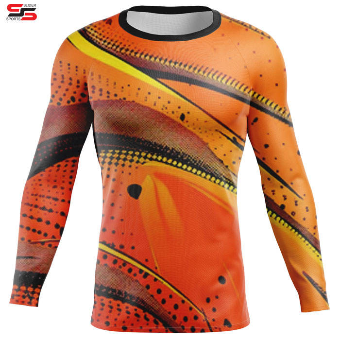 เสื้อรัดรูปแขนยาวแห้งเร็วสำหรับผู้ชายเสื้อกีฬาพิมพ์ซับลิเมชันผ้าสแปนเด็กซ์ระบายอากาศได้ดี