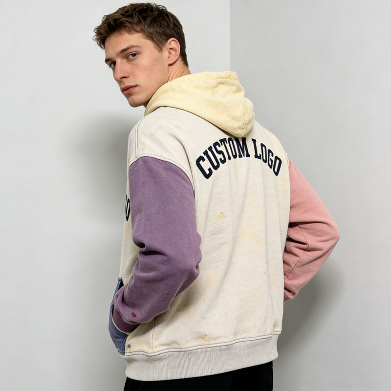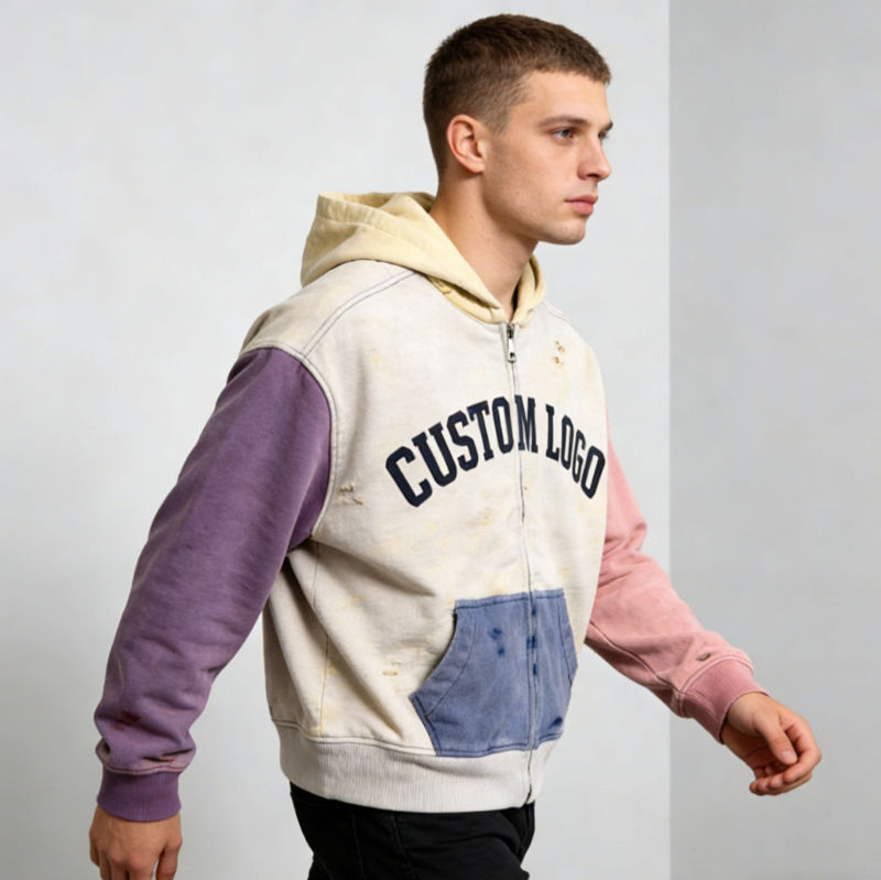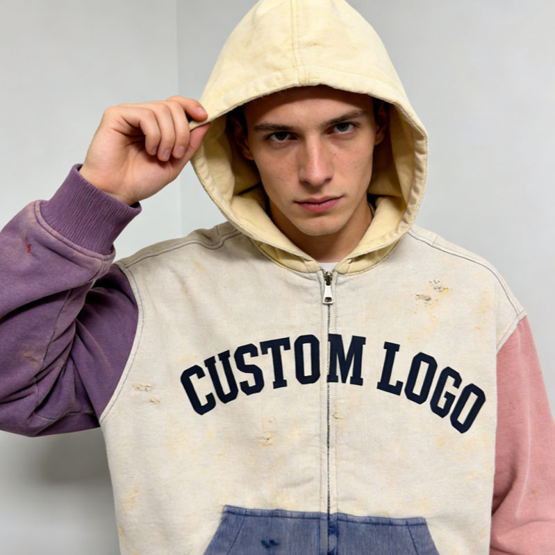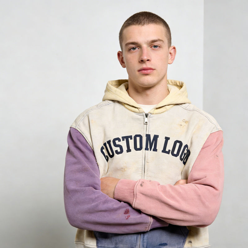 เสื้อฮู้ดดี้ผู้ชายไซส์ใหญ่ ทรงครอป แต่งสีบล็อก ซิปหน้า ลุคทำสีซีดแบบ Distressed กระเป๋าหน้าตัดกัน โลโก้สั่งทำได้ สไตล์ลำลองแนวสตรีทแวร์