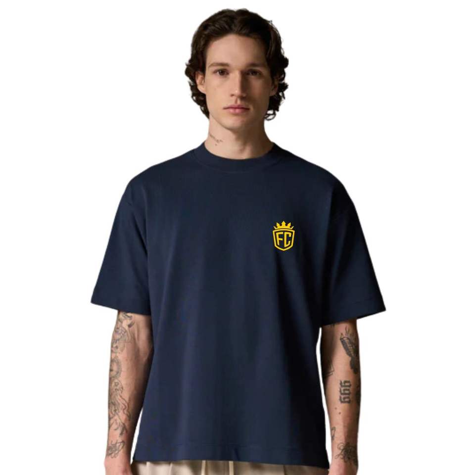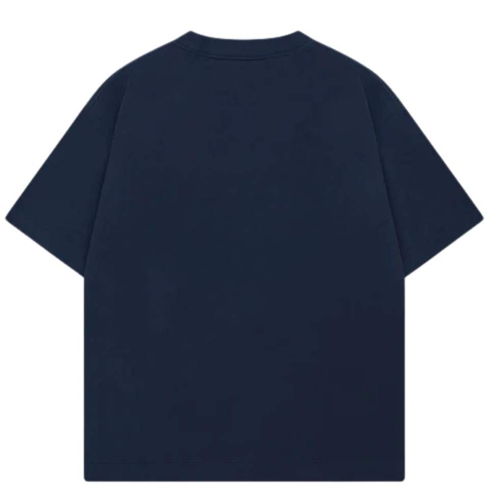 เสื้อยืดโอเวอร์ไซส์สีน้ำเงินกรมท่า แขนสั้น คอกลม ผ้าฝ้าย สไตล์ลำลอง สตรีทแวร์ โลโก้เล็กๆ ที่อก เสื้อยืดฤดูร้อนสำหรับผู้ชาย