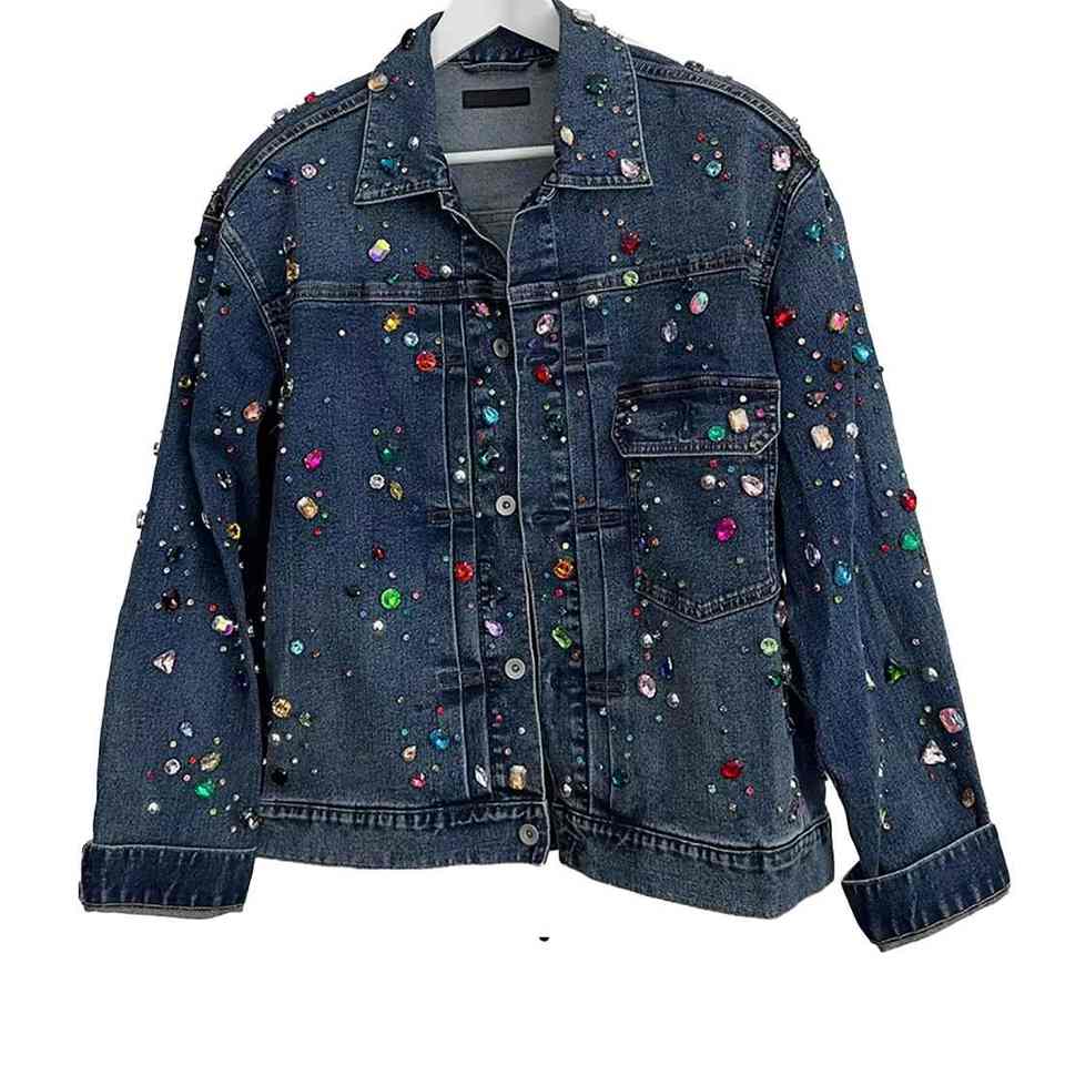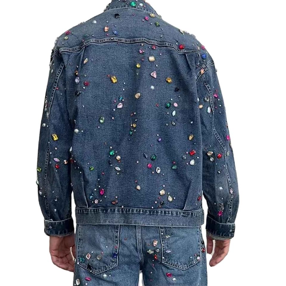 เสื้อแจ็คเก็ตยีนส์ผู้ชายทรงโอเวอร์ไซส์ สไตล์สตรีทแฟชั่น ประดับเพชรระยิบระยับ ผ้าเนื้อแน่นคุณภาพระดับมืออาชีพ ตกแต่งด้วยคริสตัล
