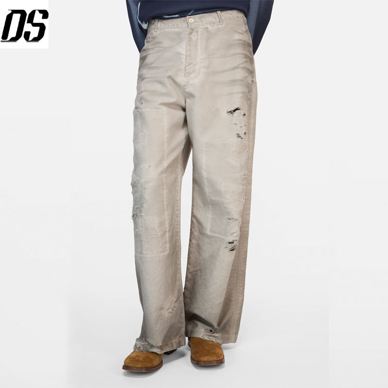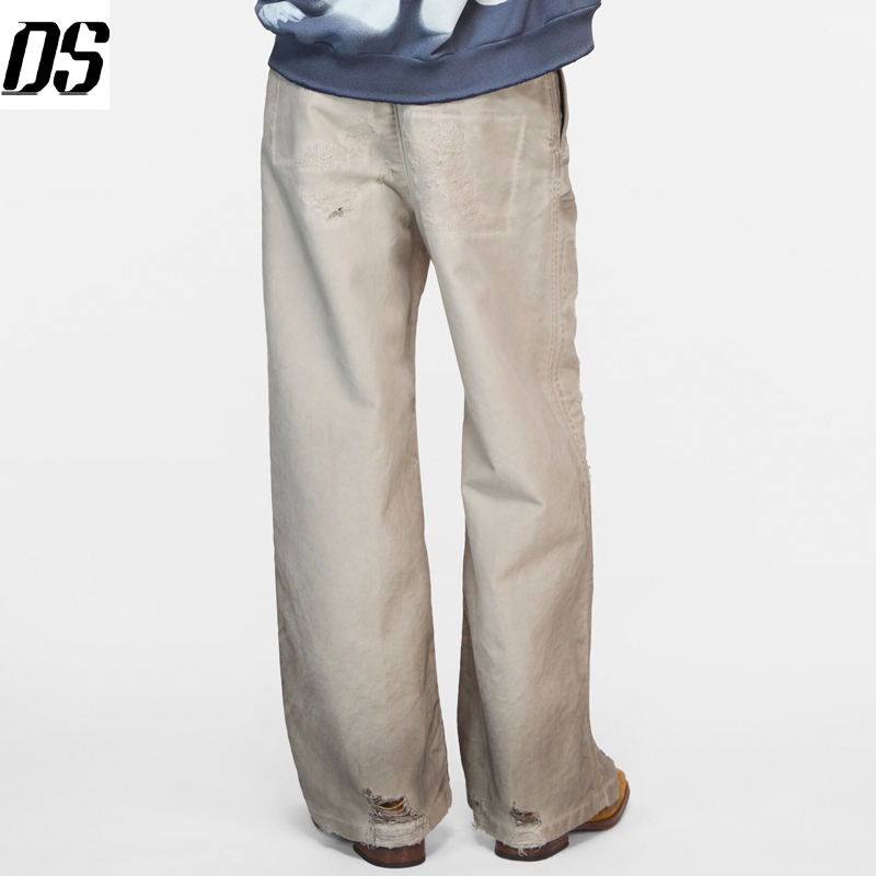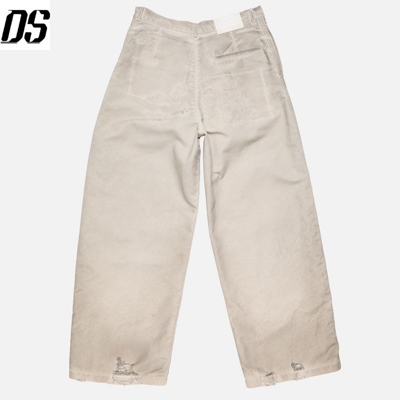 Men Pants Manufacturer Mended Trousers Light Taupe OEM Distressed Dirty Wash Loose Fit Wide Leg Jeans Men Quality Jeans
