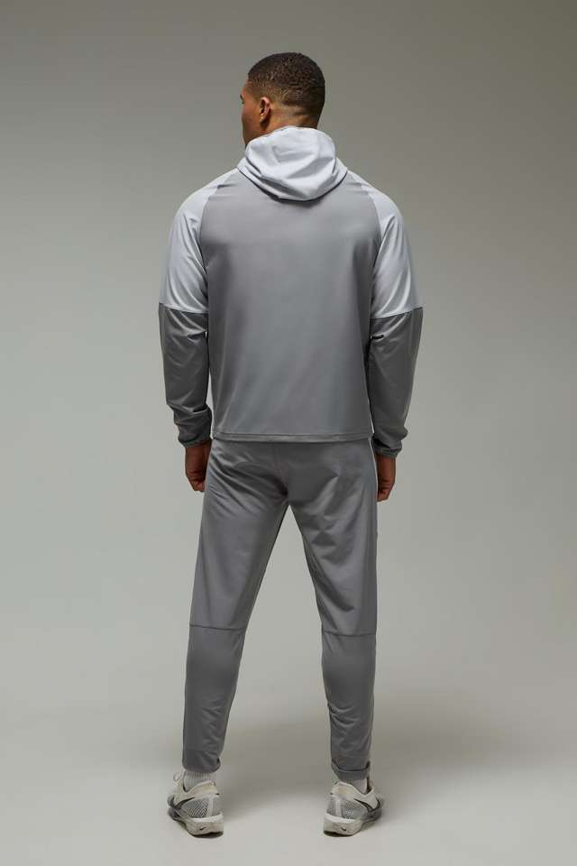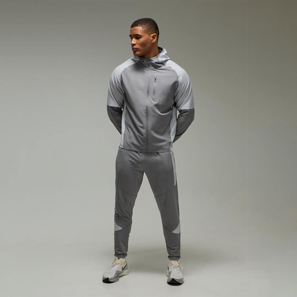 ชุดวอร์มออกกำลังกายผู้ชาย ผ้าสเตรช แจ็คเก็ตมีฮู้ด และกางเกงจ็อกเกอร์สำหรับใส่ในยิม รับผลิตแบบขายส่งและ OEM