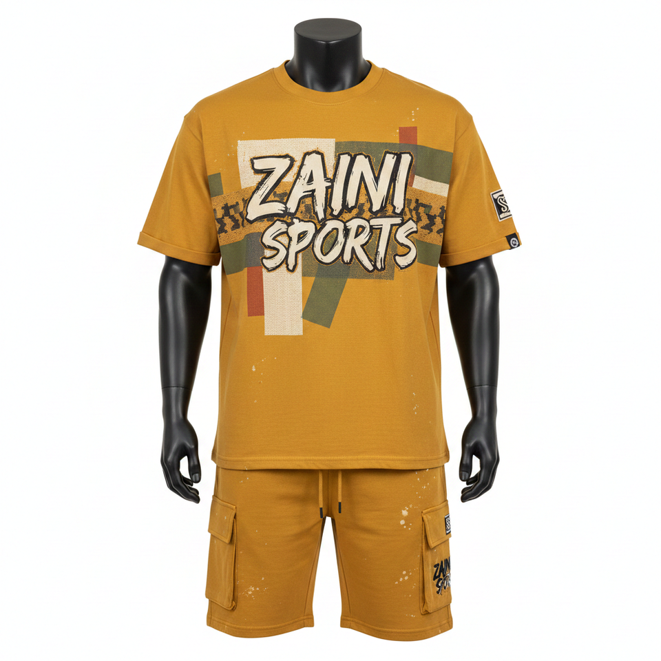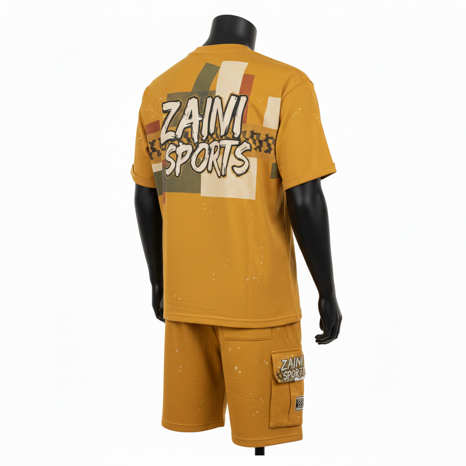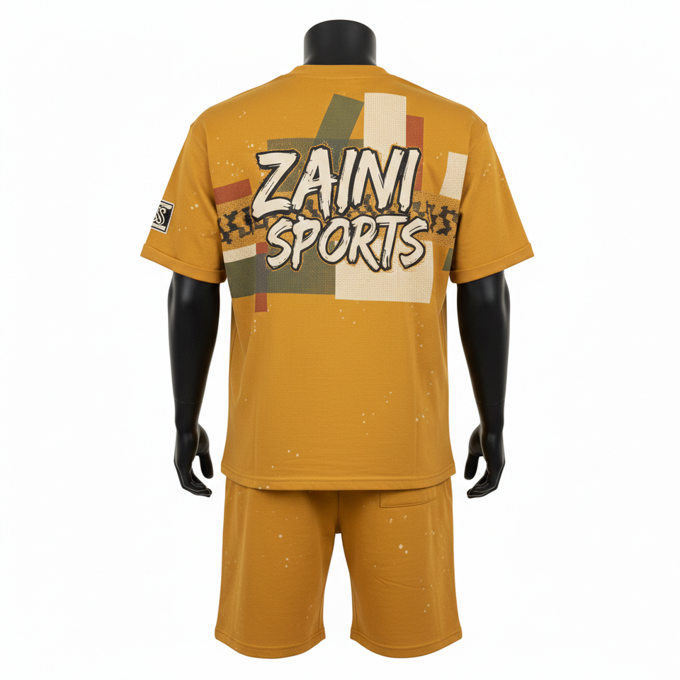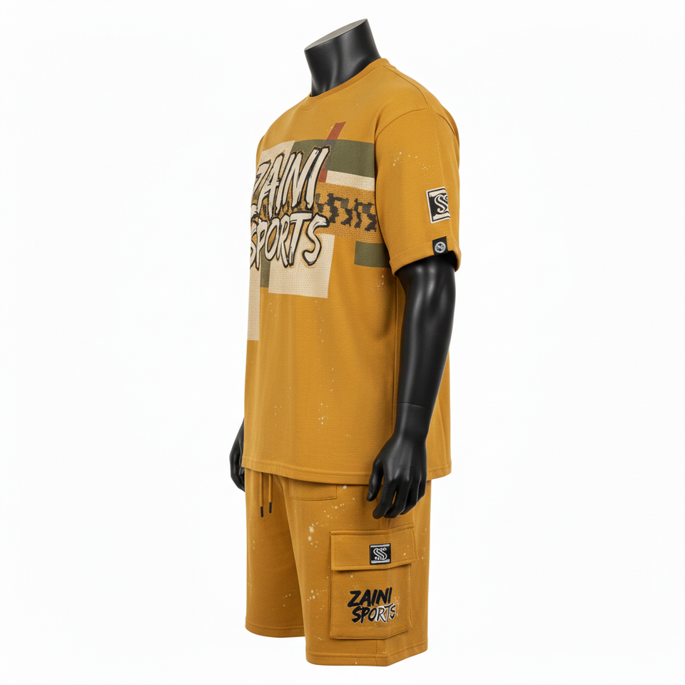 ชุดเสื้อยืดและกางเกงขาสั้นผู้ชาย ผ้าคอตตอนเจอร์ซีย์พรีเมียม GSM เนื้อนุ่ม ระบายอากาศได้ดี สีมัสตาร์ด พิมพ์ลายสกรีน โลโก้สั่งทำได้