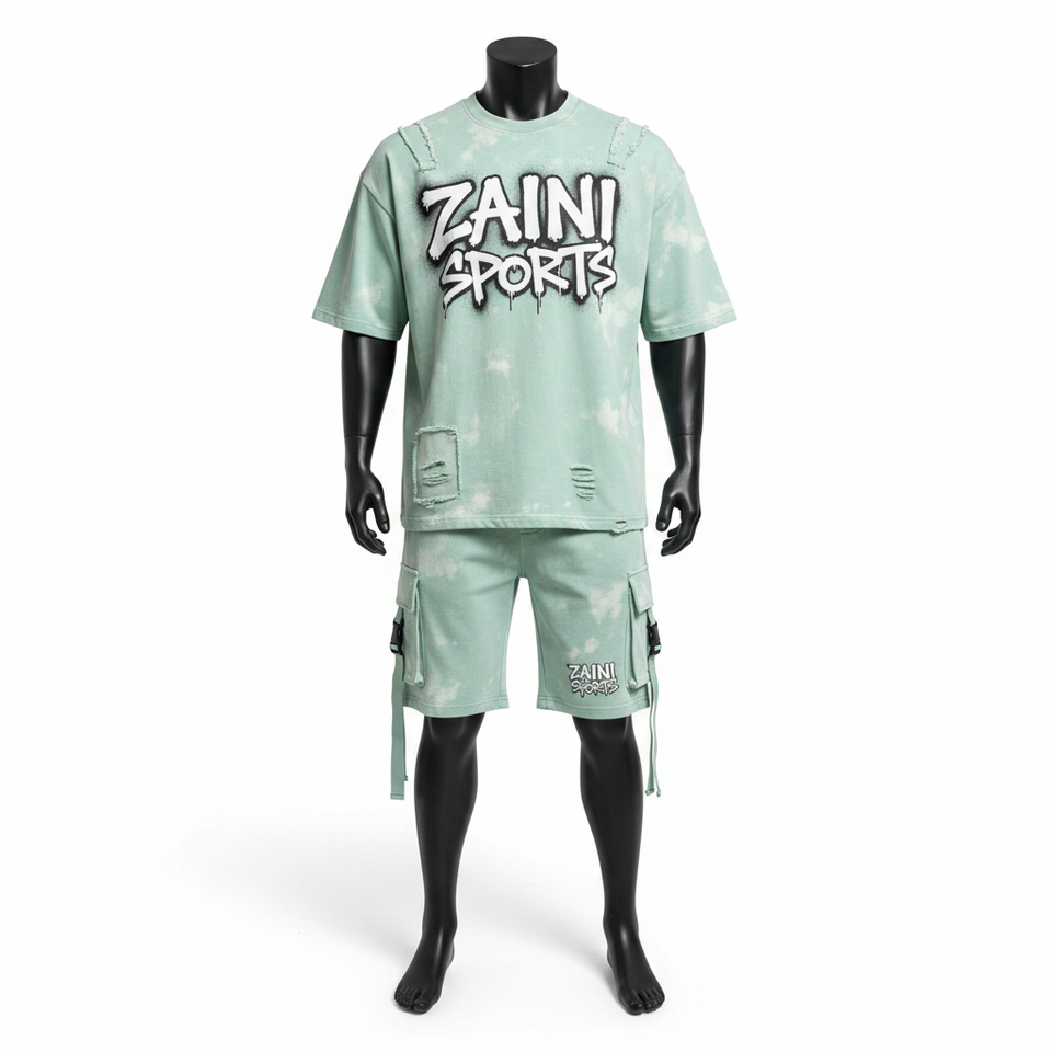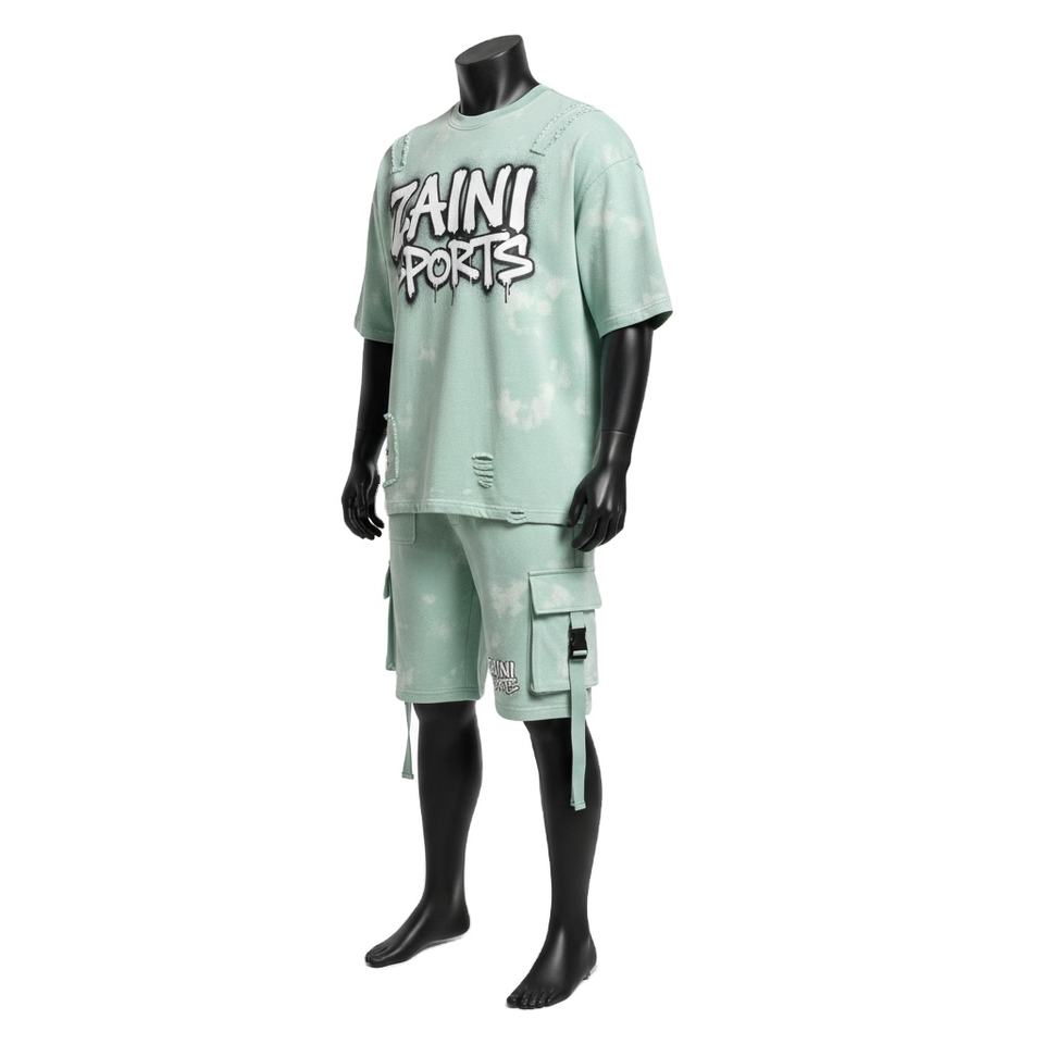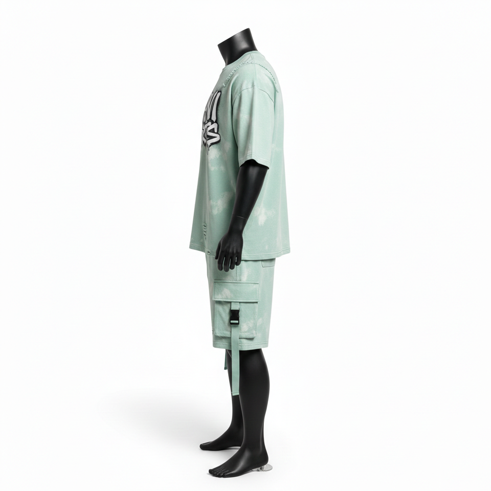 ชุดเสื้อยืดและกางเกงขาสั้นผู้ชาย ผ้าคอตตอนเจอร์ซีย์พรีเมียม GSM เนื้อผ้านุ่มแบบซักแล้ว สีมิ้นท์ พิมพ์ลายพัฟ พร้อมสกรีนโลโก้ตามสั่ง