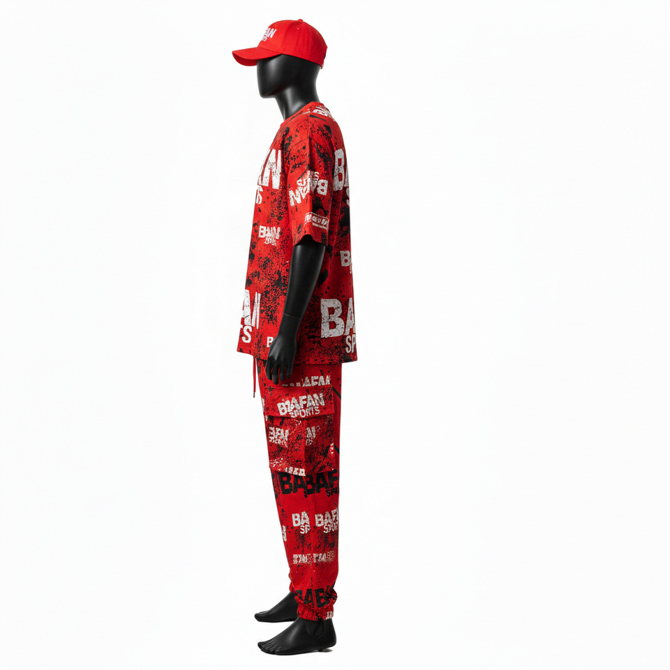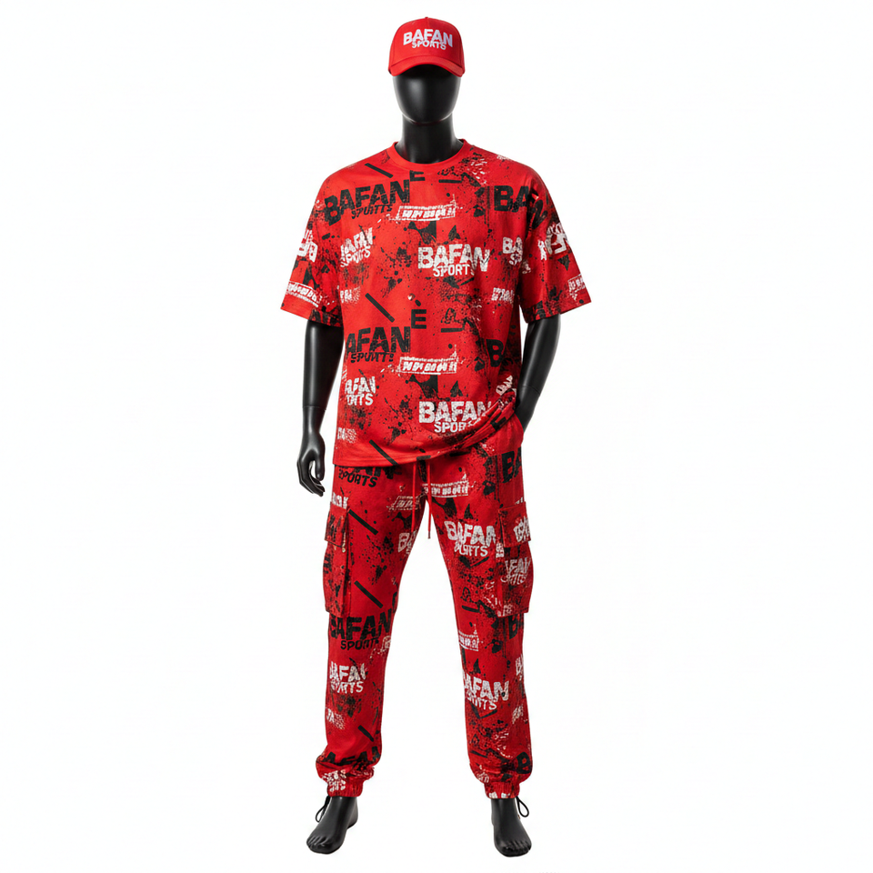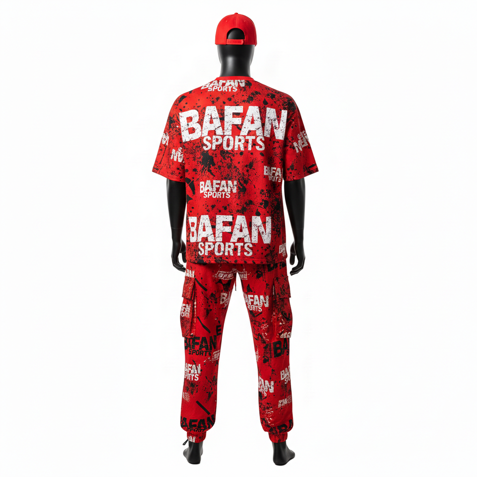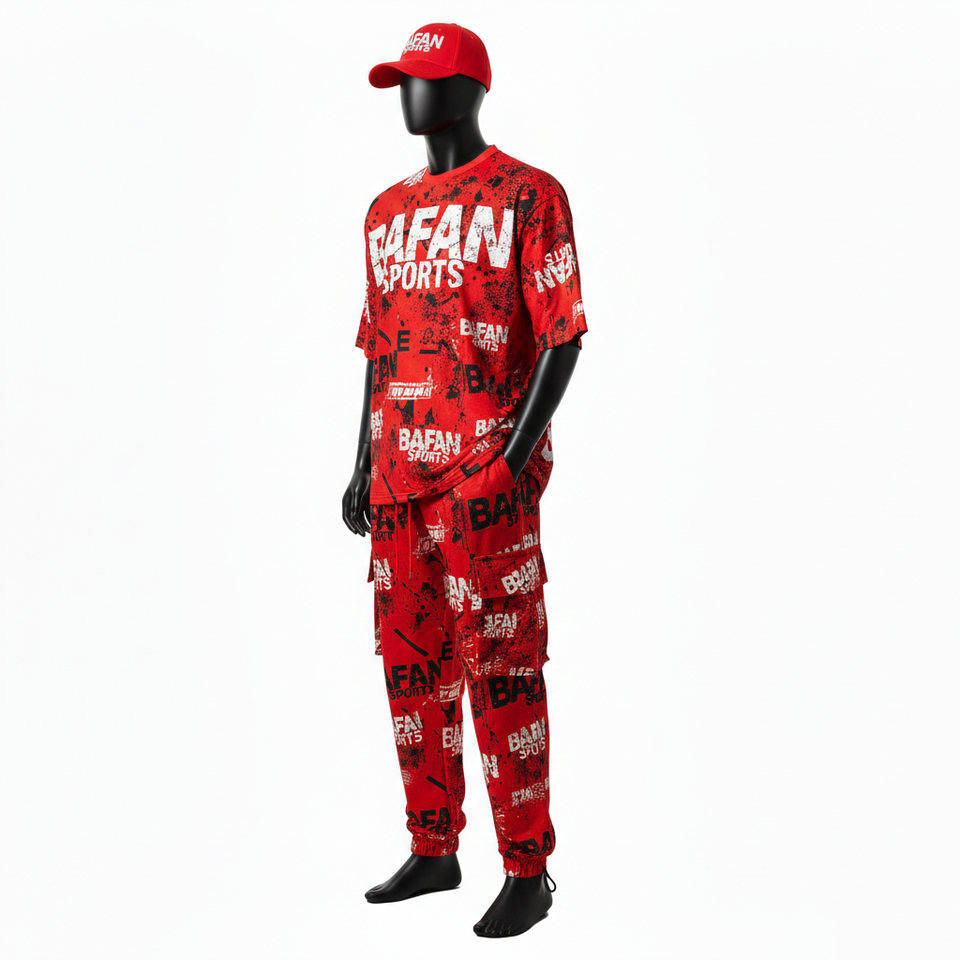 เสื้อยืดเจอร์ซีย์ผ้าฝ้ายผสมโพลีเอสเตอร์พรีเมียมสำหรับผู้ชาย ชุด 2 ชิ้น 180 GSM ระบายอากาศได้ดี สีแดง พิมพ์ลายทั่วตัว โลโก้สั่งทำ ชุด 2 ชิ้น สำหรับผู้ชาย