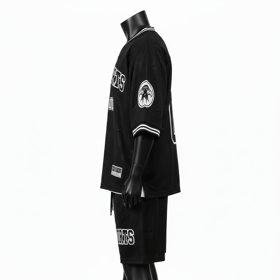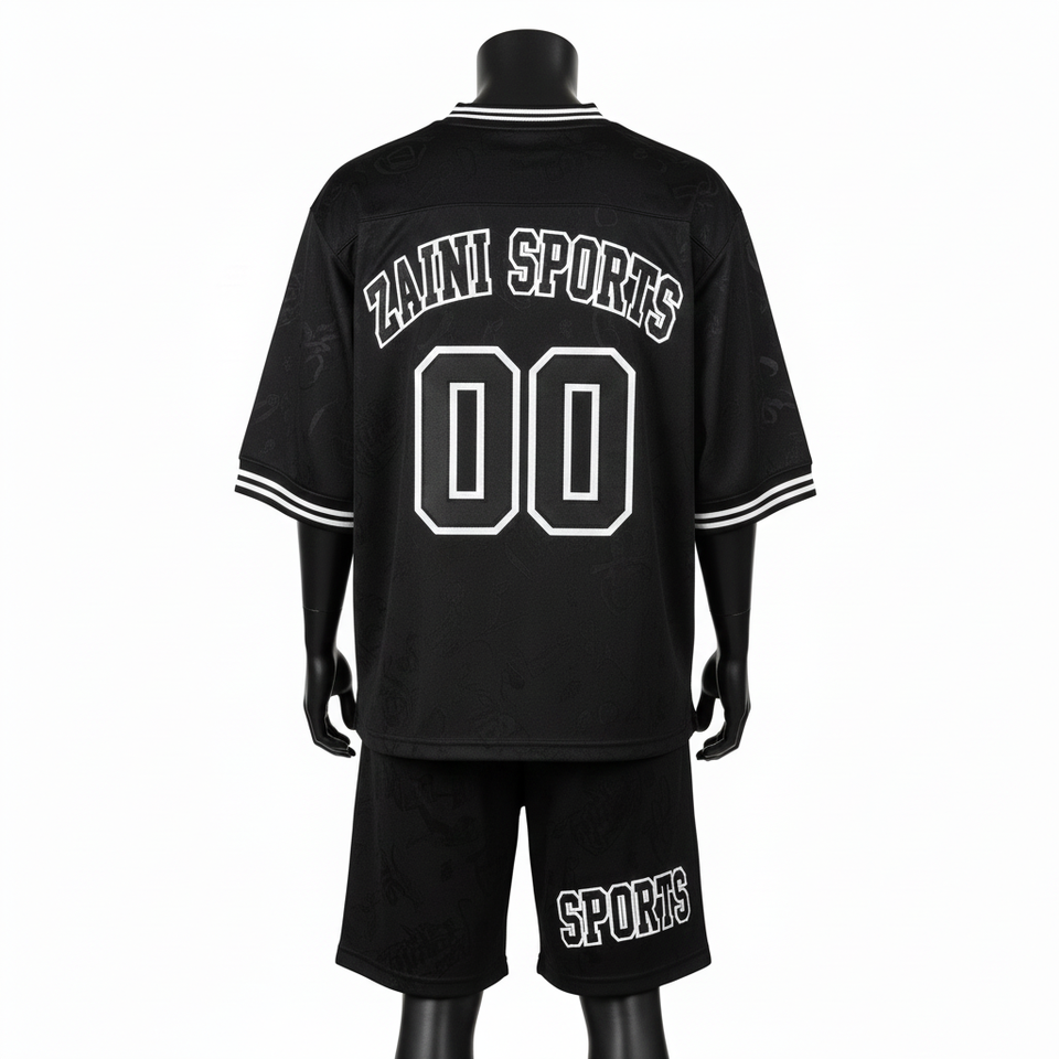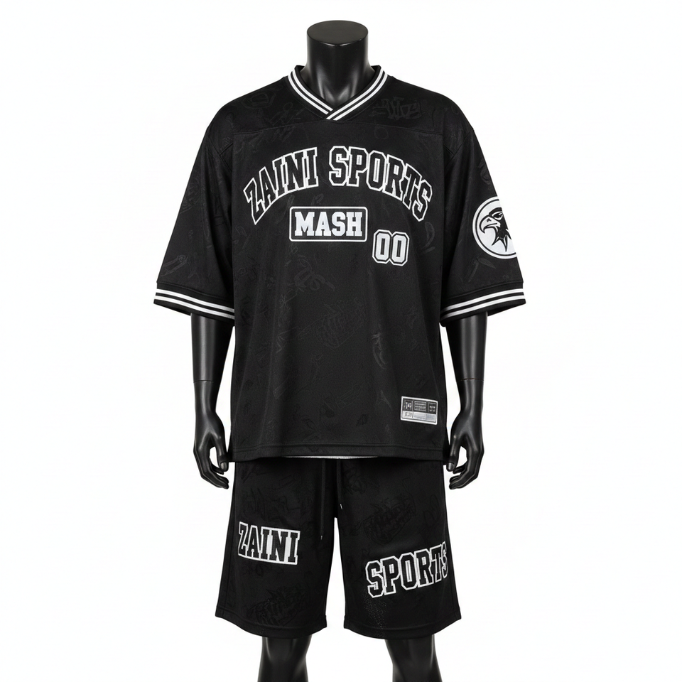 ชุดเสื้อเจอร์ซีย์ตาข่ายพรีเมียมสำหรับผู้ชาย 220 GSM ผ้าโพลีเอสเตอร์ระบายอากาศ สีดำ พิมพ์ลายแบบซับลิเมชั่น ผ้าทอลายทวิล ปักโลโก้ตามสั่ง