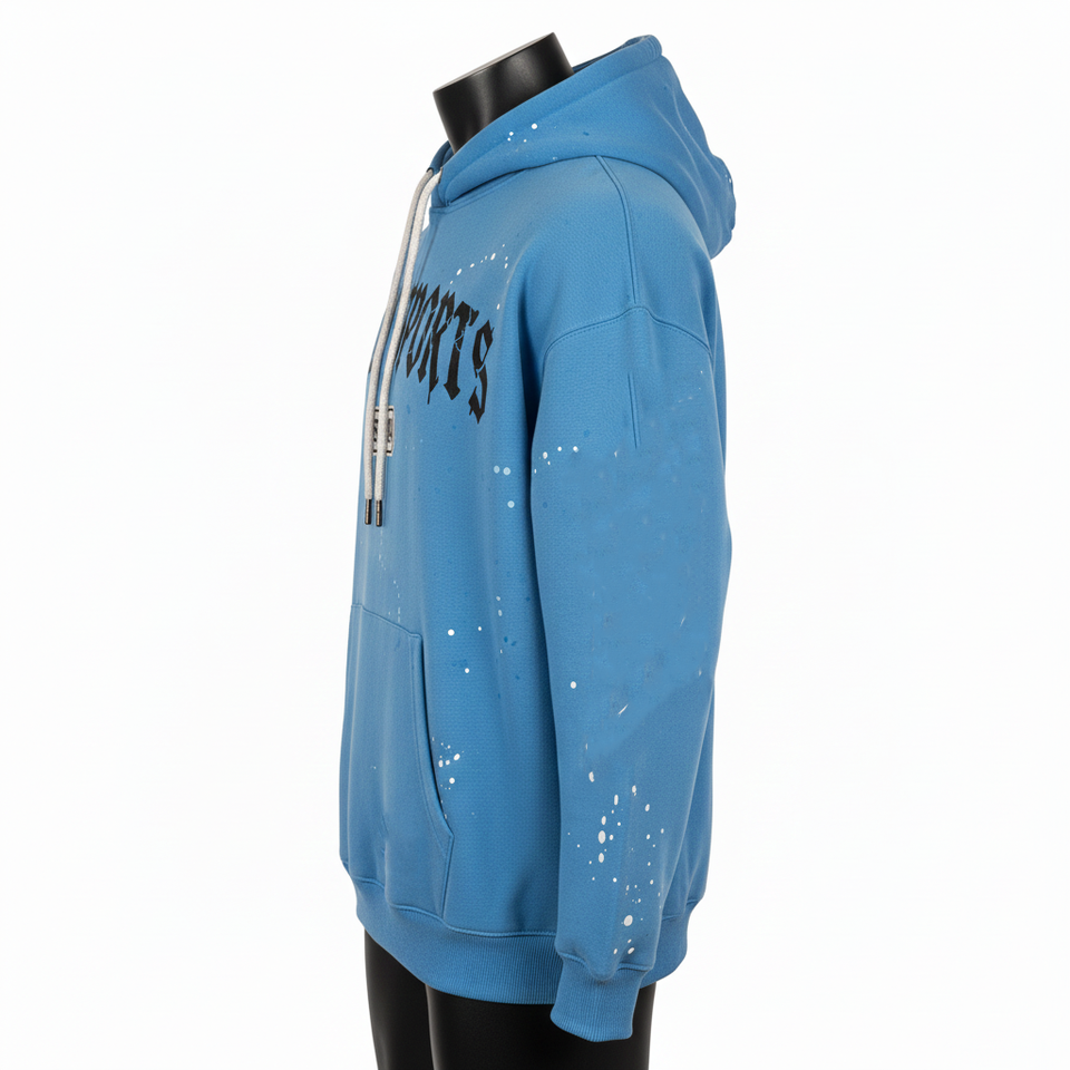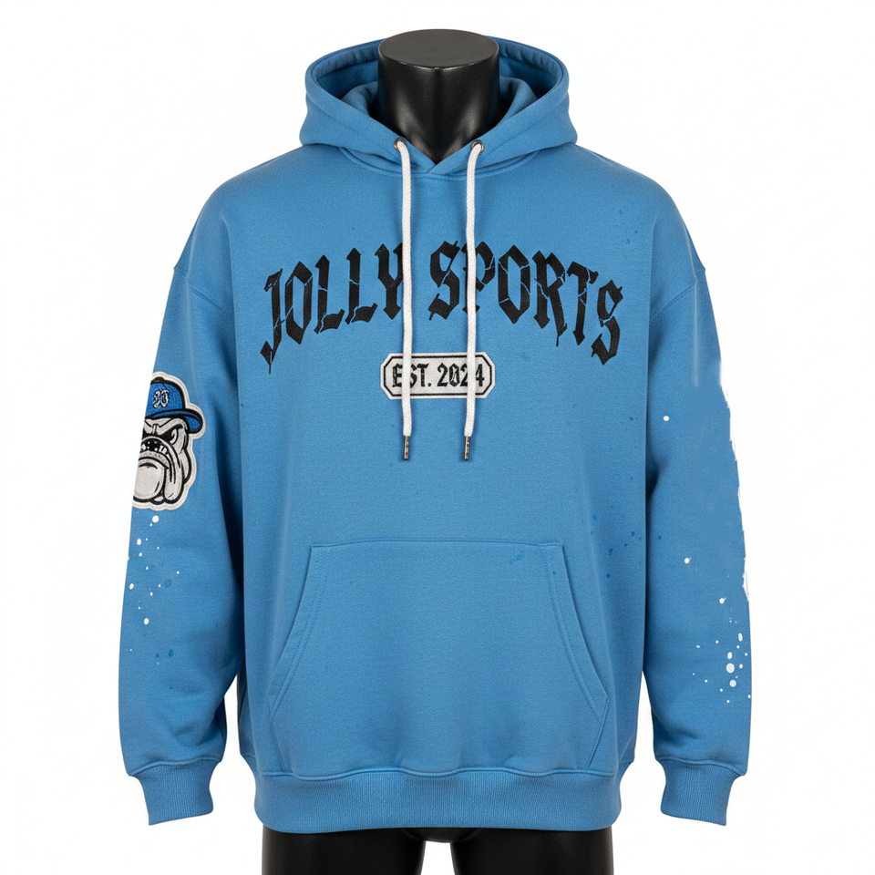 เสื้อฮู้ดผู้ชายผ้าคอตตอนผสมขนแกะหนานุ่ม 320 GSM สีน้ำเงิน สไตล์สตรีทแวร์ พิมพ์ลายพัฟฟ์ ปักโลโก้ เสื้อฮู้ดพื้นฐาน