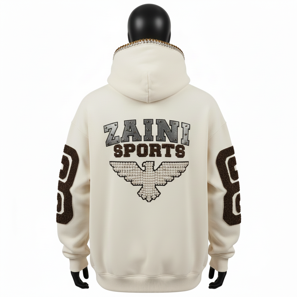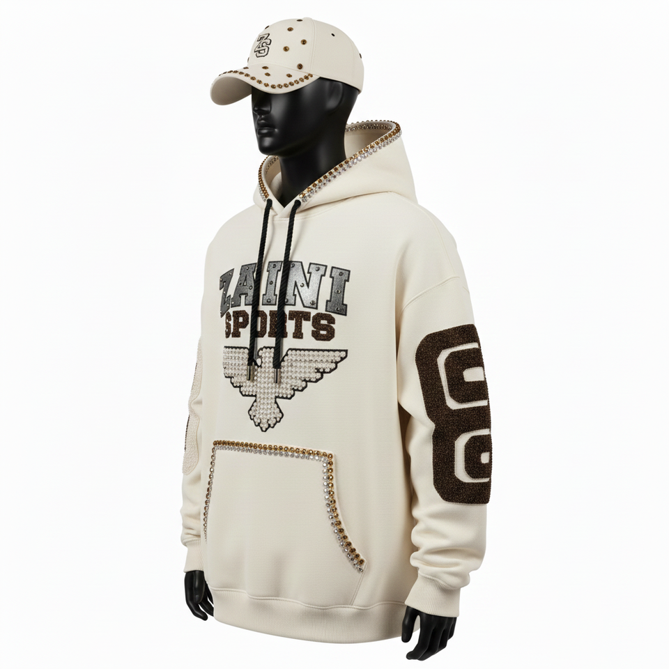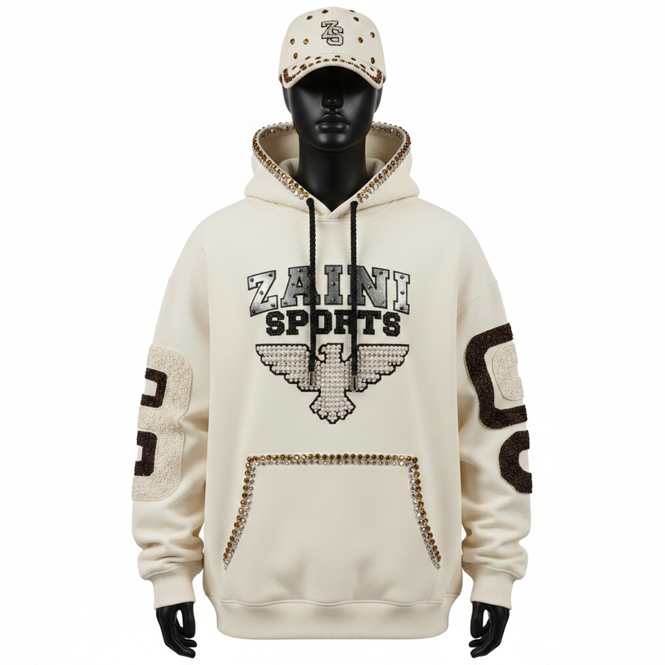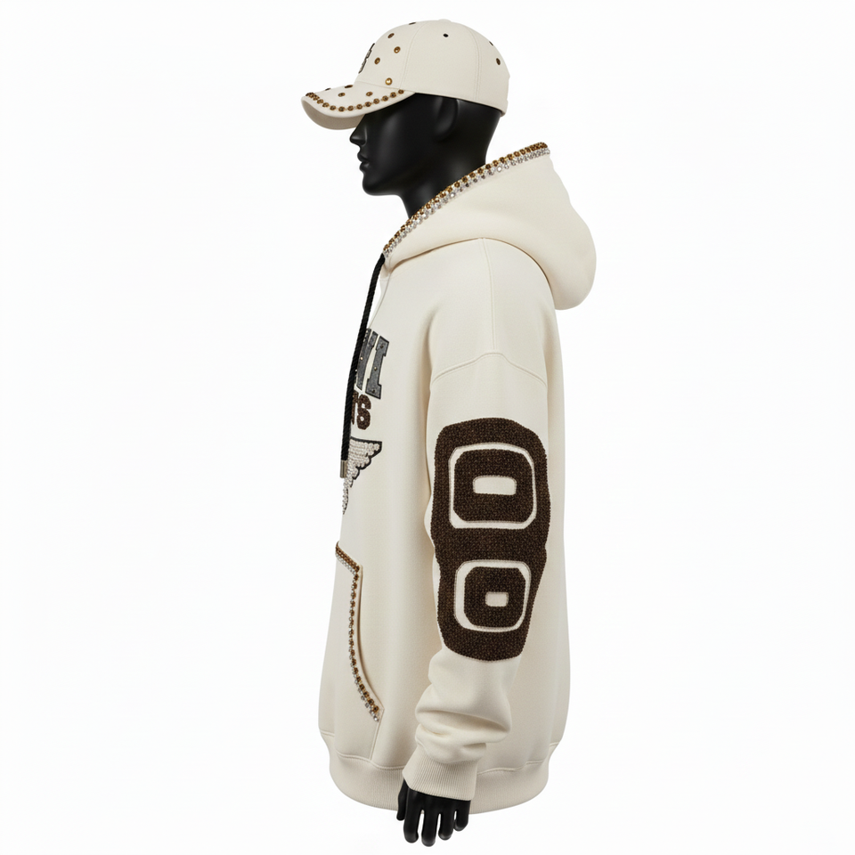 Men Pullover Hoodie Premium Brushed Cotton Blend Fleece GSM Cream Tone Chenille Embroidery Stud Logo Men's Basics Hoodies