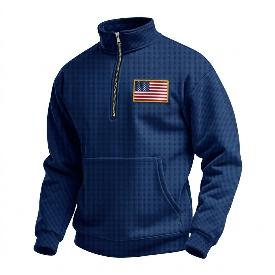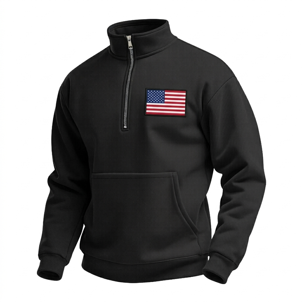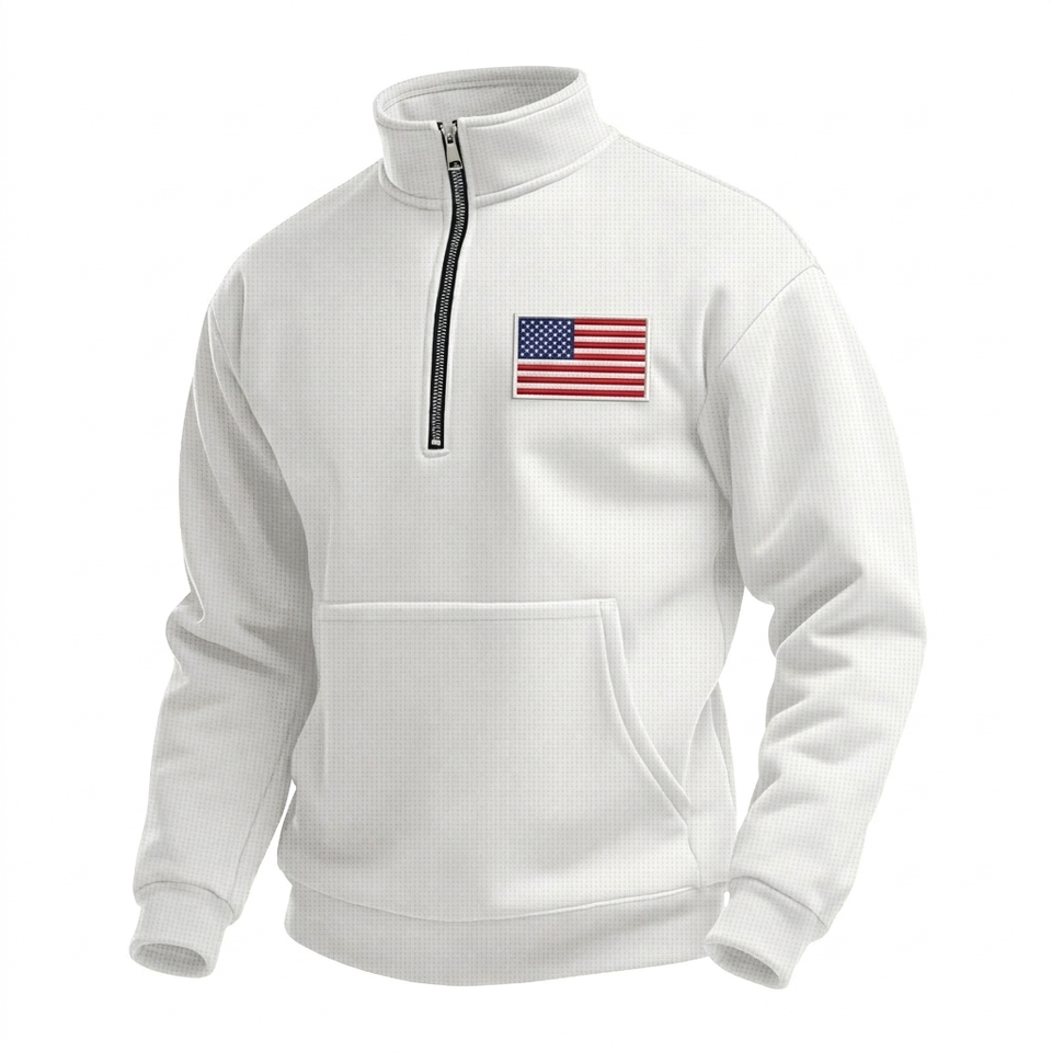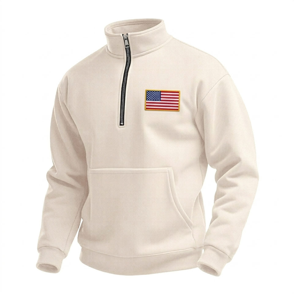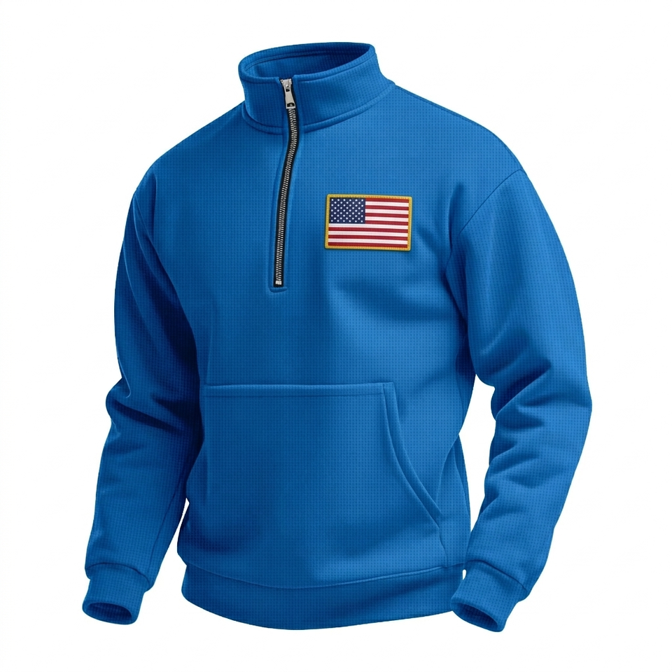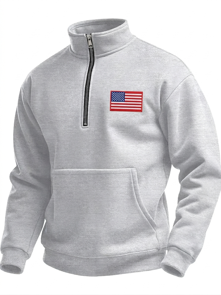 เสื้อสเวตเชิ้ตผู้ชายแบบซิป ¼ ตัว ปักลาย ถักนิตติ้ง ผ้าฟลีซ คอสูง แขนยาว สวมใส่สบาย มีกระเป๋าจิงโจ้