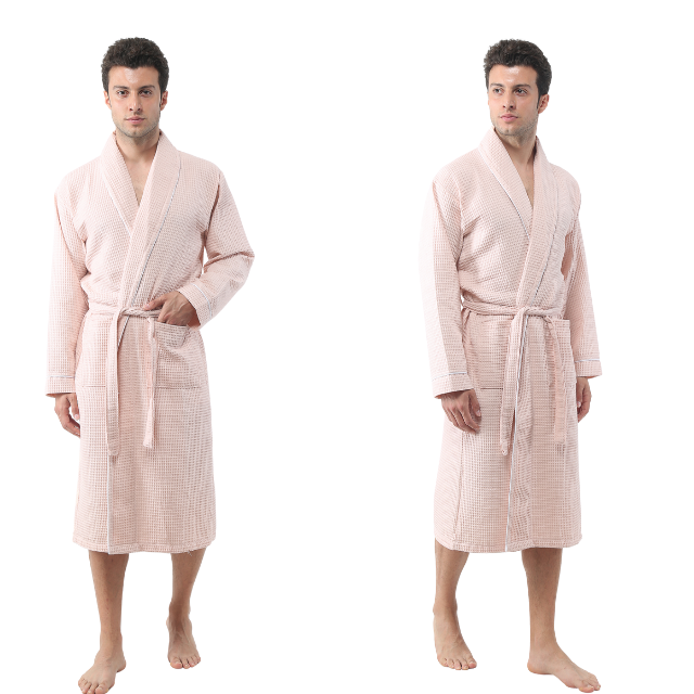 เสื้อคลุมอาบน้ำผ้าวาฟเฟิลผู้ชาย ผลิตจากผ้าฝ้ายตุรกี 100% น้ำหนักเบา แห้งเร็ว เหมาะสำหรับสปาและโรงแรม พร้อมเข็มขัดและกระเป๋า