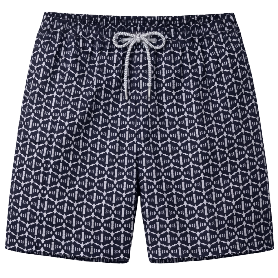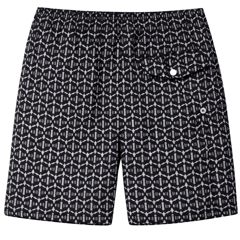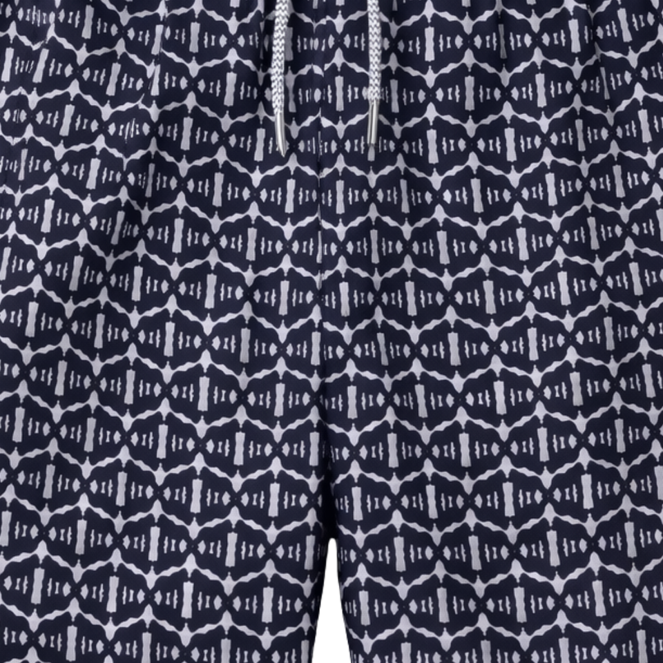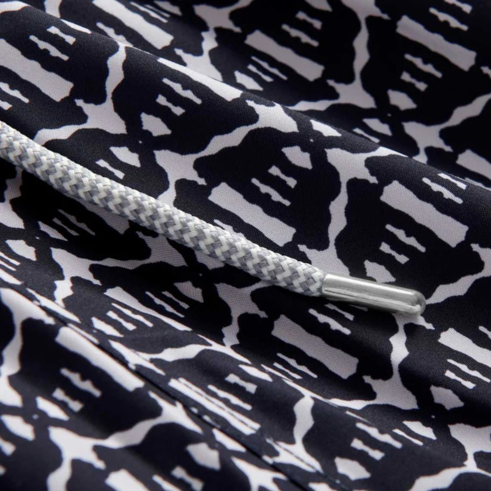 กางเกงว่ายน้ำชาย รีไซเคิล ลายดำนามธรรม แห้งเร็ว สำหรับชายหาด มีเชือกผูกเอวและกระเป๋า