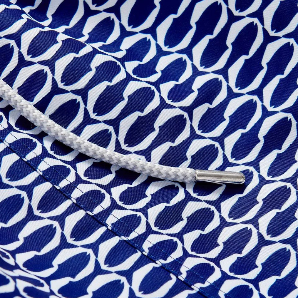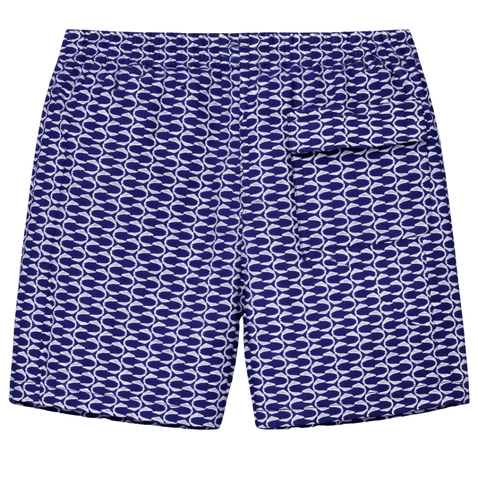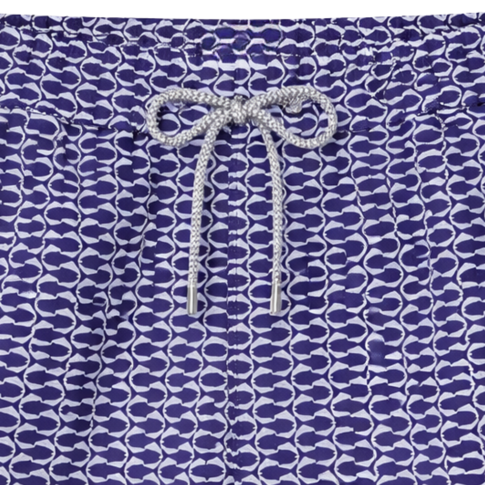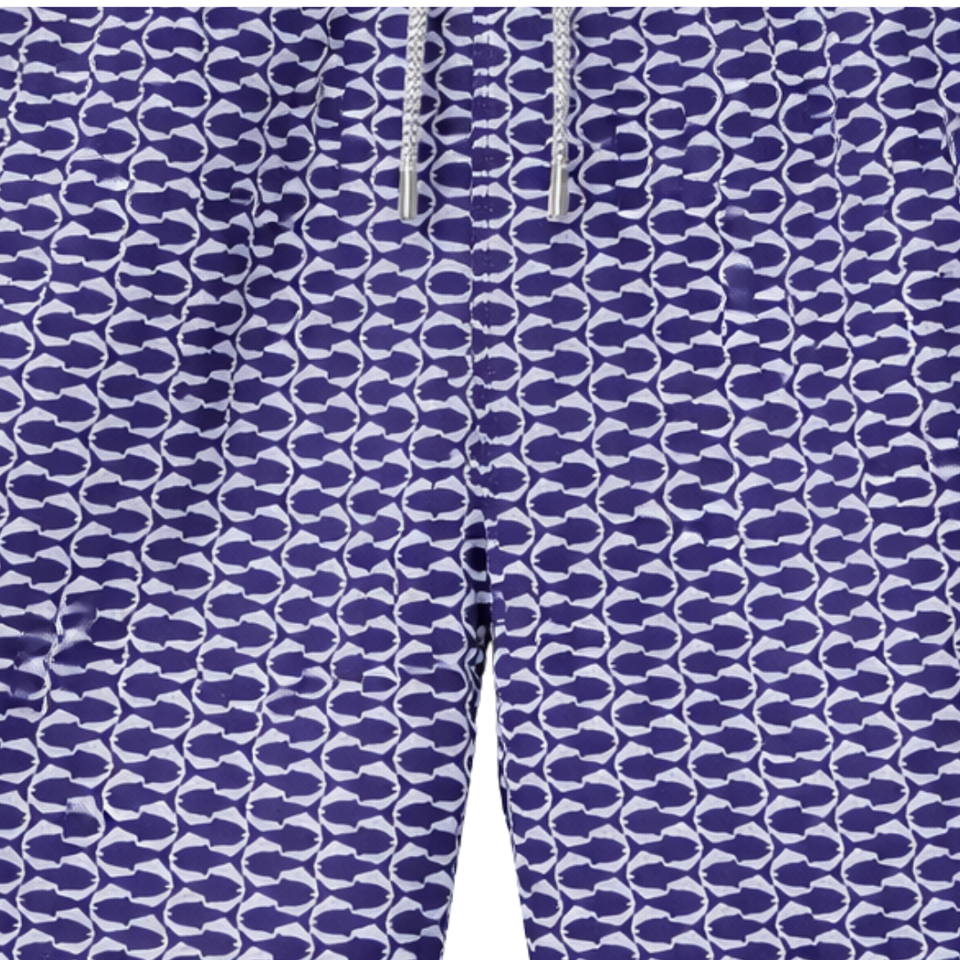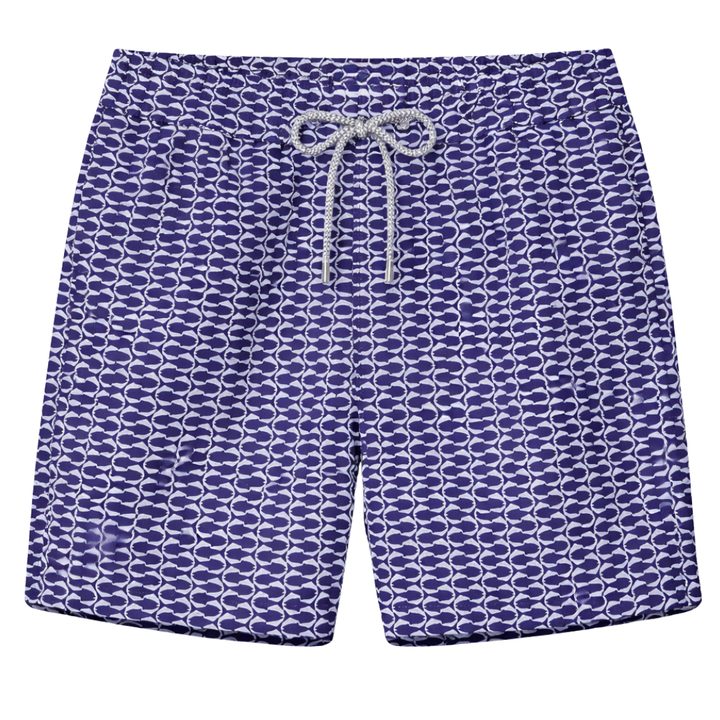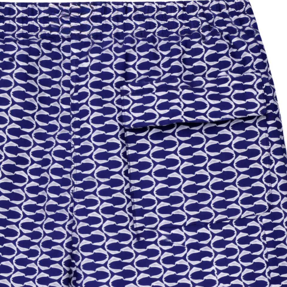 กางเกงว่ายน้ำชาย รีไซเคิล ลายเกล็ดปลา สีน้ำเงิน แห้งเร็ว มีเชือกผูกเอวและกระเป๋า