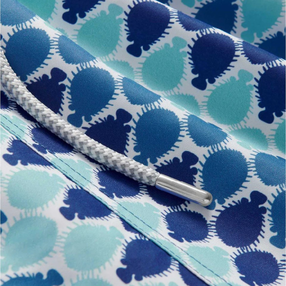 กางเกงว่ายน้ำชายแบบรีไซเคิล สีน้ำเงิน ลายจุดเรขาคณิต แห้งเร็ว มีเชือกผูกเอวและกระเป๋า