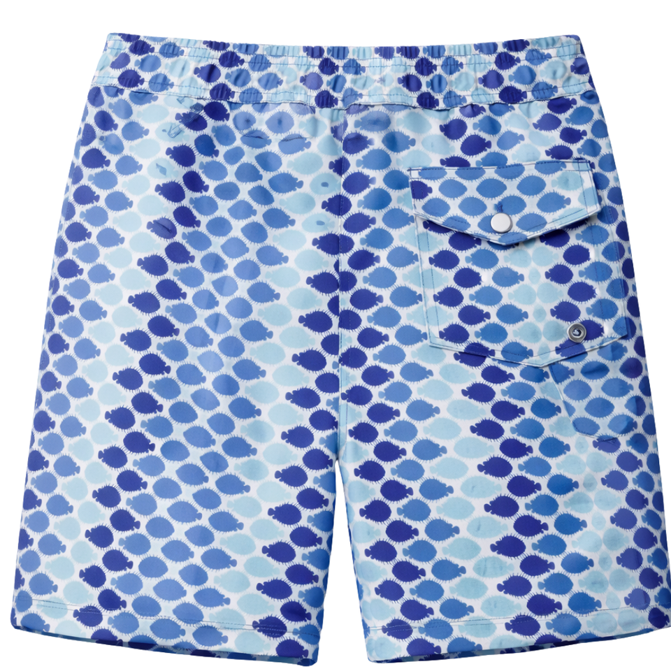 กางเกงว่ายน้ำชายแบบรีไซเคิล สีน้ำเงิน ลายจุดเรขาคณิต แห้งเร็ว มีเชือกผูกเอวและกระเป๋า