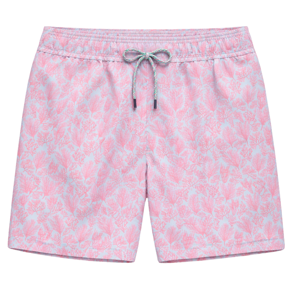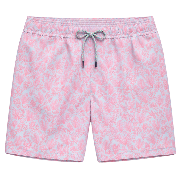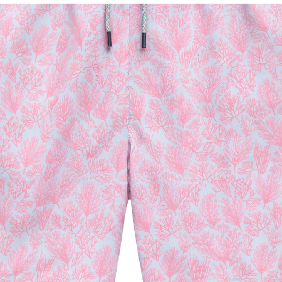 กางเกงว่ายน้ำชาย รีไซเคิล ลายปะการังสีชมพู แห้งเร็ว มีเชือกผูกเอวและกระเป๋า