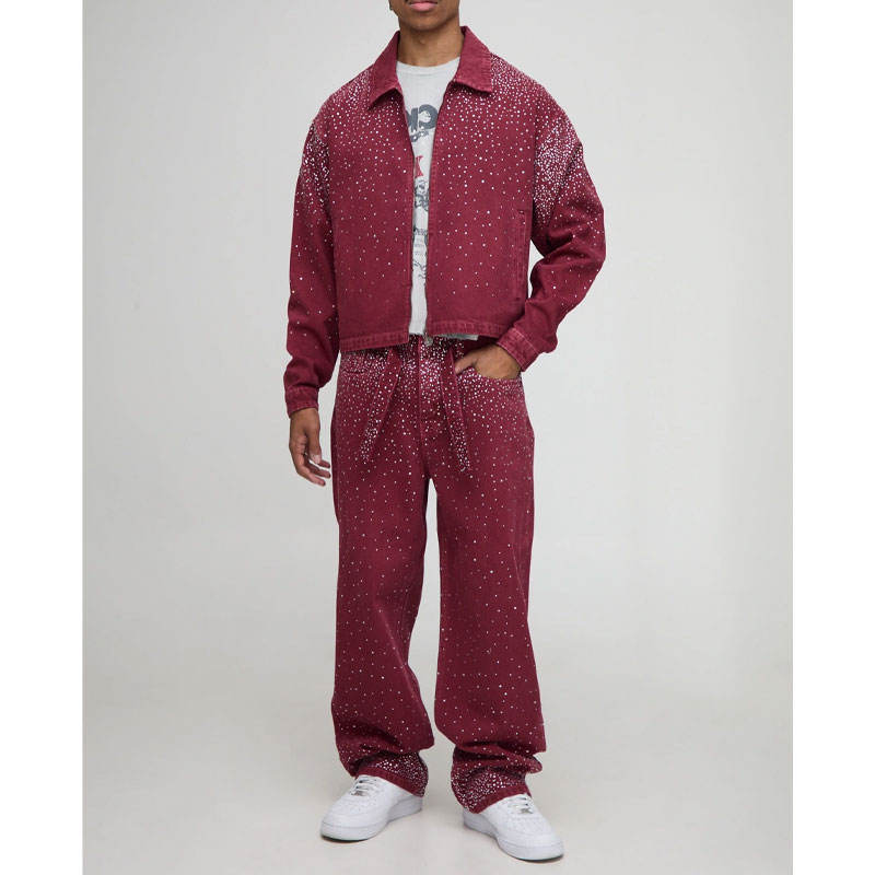 เสื้อแจ็คเก็ตยีนส์ผู้ชายประดับเพชรเทียม ฮู้ดถอดได้ สไตล์ลำลองแนวสตรีท ขายส่งแบบ OEM