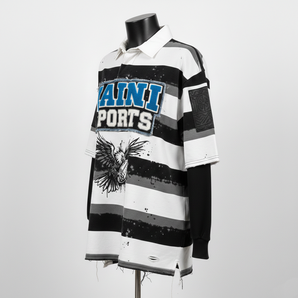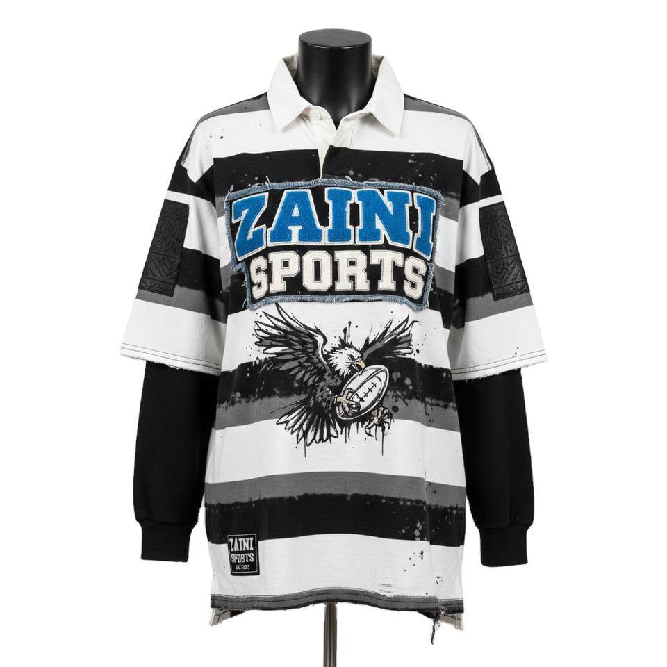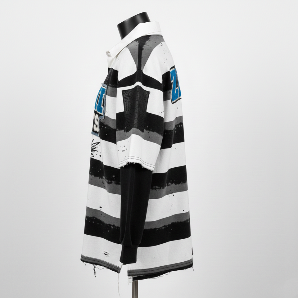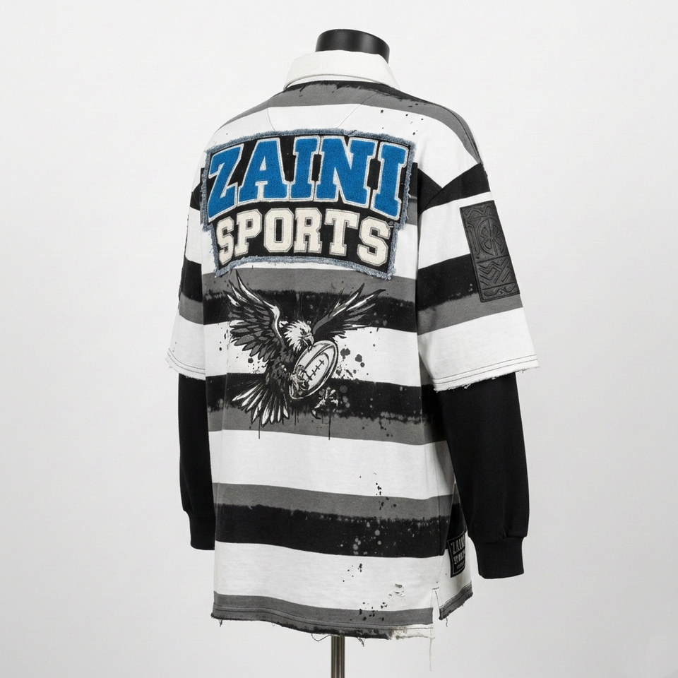 เสื้อรักบี้ชาย ผ้าเจอร์ซีย์คอตตอนหนา 240 GSM สีดำ ลายแถบขาว ดีไซน์ปักลาย พิมพ์โลโก้ตามสั่ง ระบายเหงื่อได้ดี
