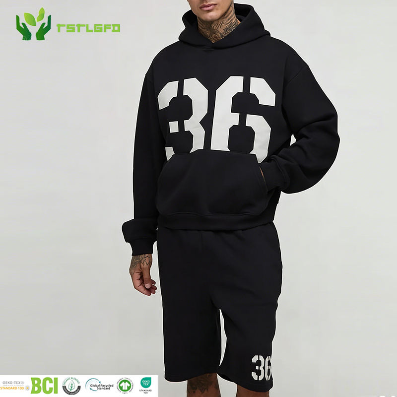ชุดกีฬาผู้ชายสำหรับฤดูใบไม้ร่วง พิมพ์ลาย DTG เสื้อฮู้ดดี้ กางเกงขาสั้น ผ้าฝ้ายออร์แกนิค 100% ซักย้อมแบบแอซิดวอช ยืดได้สี่ทิศทาง ชุดเข้าชุด 2 ชิ้น