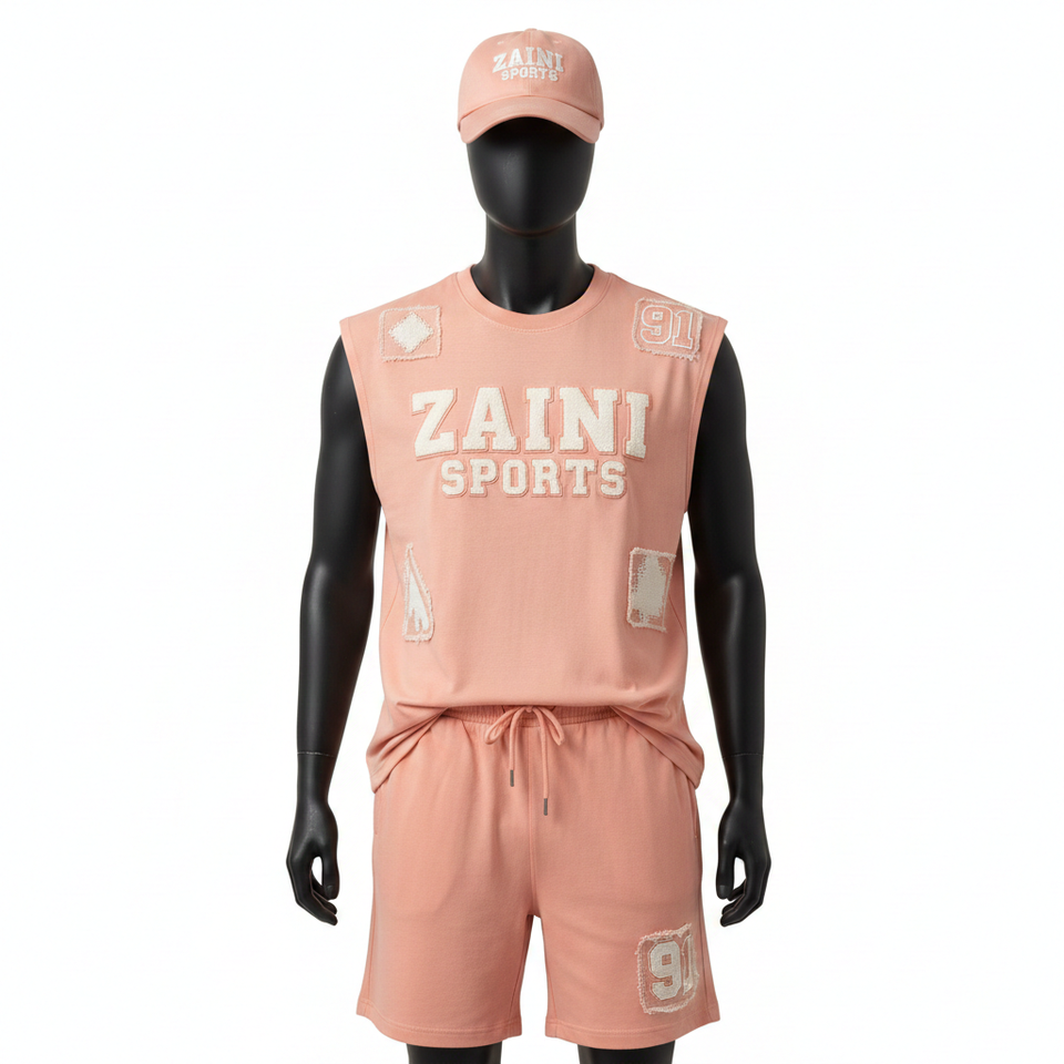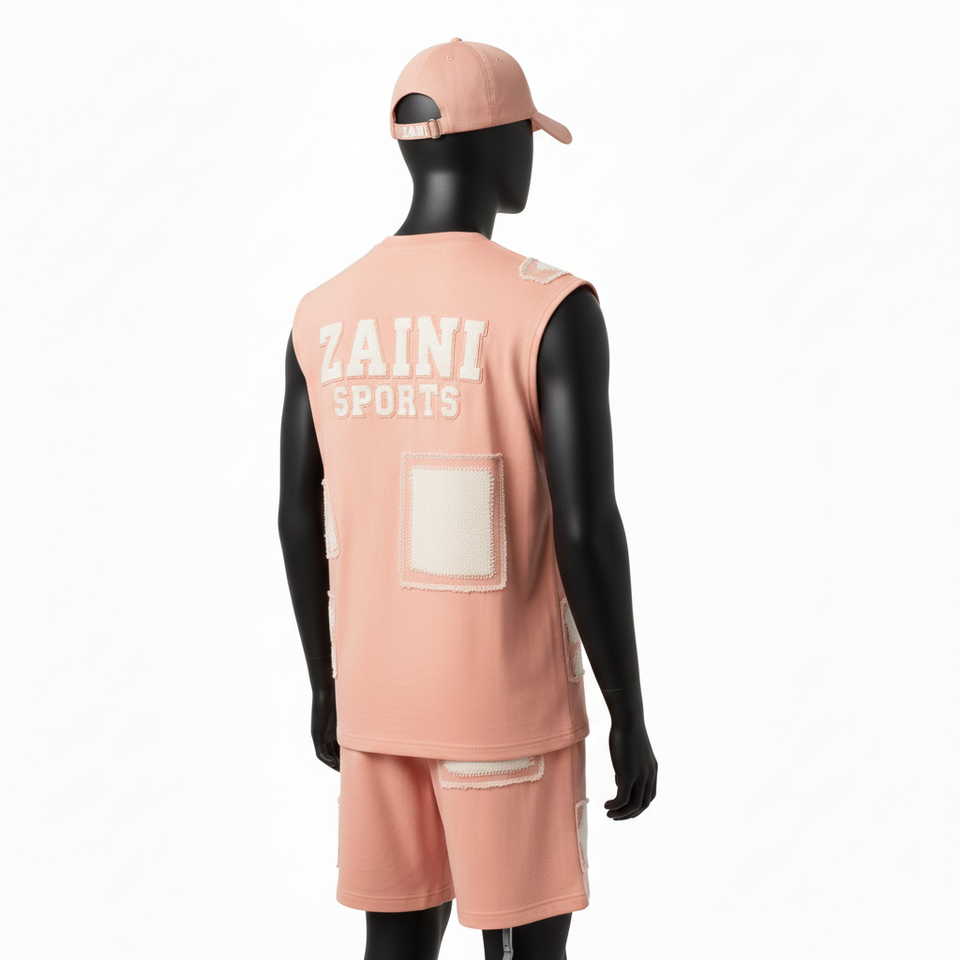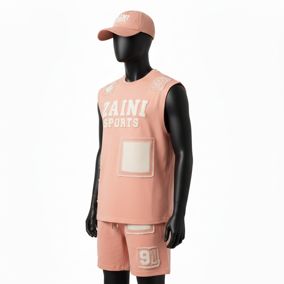 ชุดเสื้อยืดแขนกุดและกางเกงขาสั้นผู้ชาย ผ้าคอตตอนผสมเฟรนช์เทอร์รี่ ระบายอากาศได้ดี สีพีชล้วน รับสกรีนโลโก้