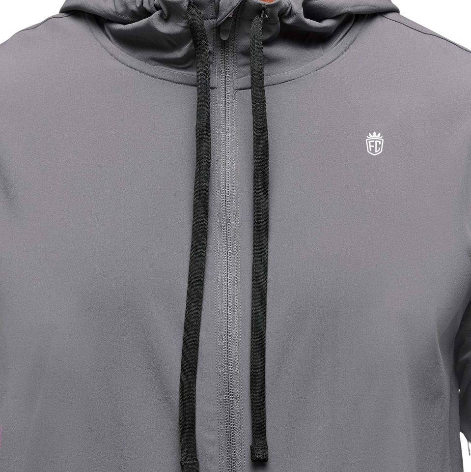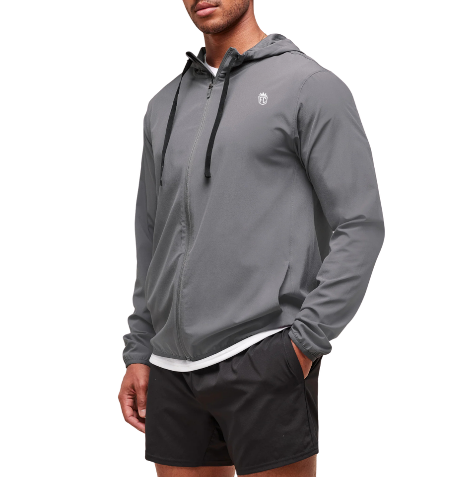 เสื้อแจ็คเก็ตมีฮู้ดทรงสลิมฟิตสำหรับผู้ชาย น้ำหนักเบา ซิปหน้า กันลม เหมาะสำหรับวิ่ง ออกกำลังกาย เล่นกีฬา ชุดลำลอง แอคทีฟแวร์ สีเทา