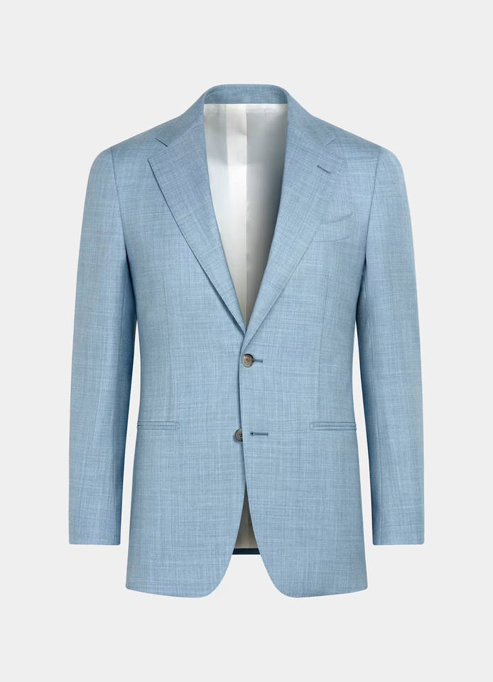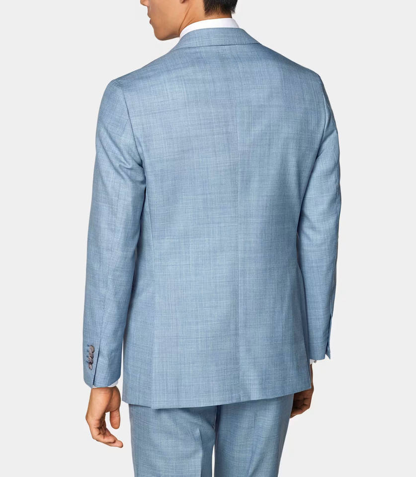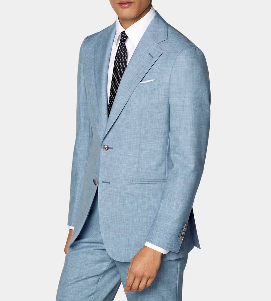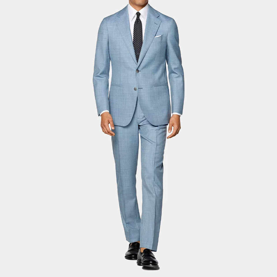 ชุดสูทผู้ชายทรงสลิม ผ้าวูล/ผ้าไหม จับจีบ ตัดเย็บตามสั่ง พรีเมียม สีฟ้าอ่อน ทรงเข้ารูป แจ็คเก็ตและกางเกง สำหรับธุรกิจและงานแต่งงาน