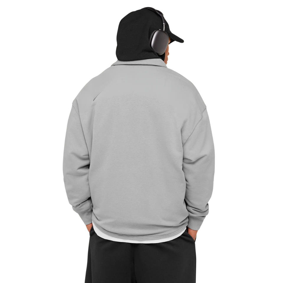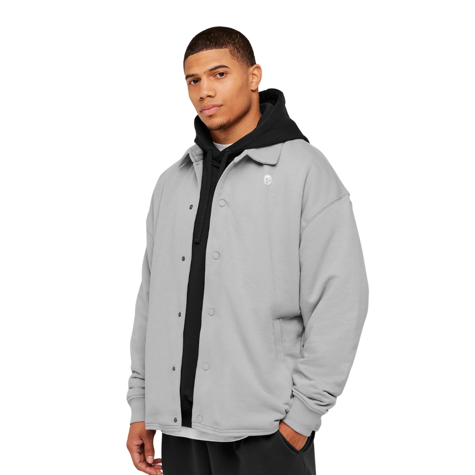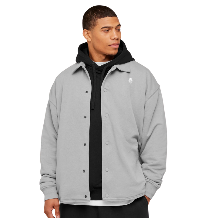 เสื้อแจ็คเก็ตผู้ชายสีเทาสโมคกี้ทรงโอเวอร์ไซส์ติดกระดุมแบบสแนป สไตล์สตรีทแวร์ลำลอง ชุดกีฬา เสื้อกันลม เสื้อคลุม