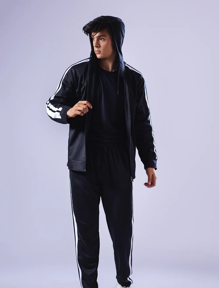 ชุดวอร์มสีดำแนวสปอร์ตสำหรับผู้ชายดีไซน์ทันสมัยพร้อมแถบสีขาวเน้นสไตล์และชุดออกกำลังกายที่ใช้งานได้จริง