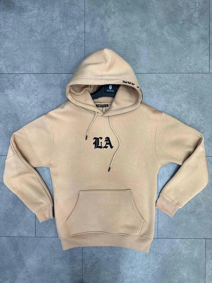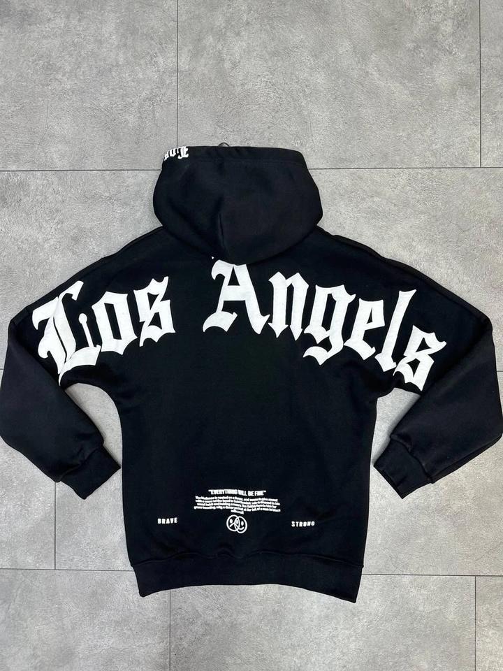 เสื้อฮู้ดดี้โอเวอร์ไซส์ผ้าฟลีซปักลายกราฟิกสไตล์อังกฤษโบราณ โลโก้โค้งคลาสสิกลอสแอนเจลิส ผ้าฝ้าย 100% สำหรับผู้ชาย