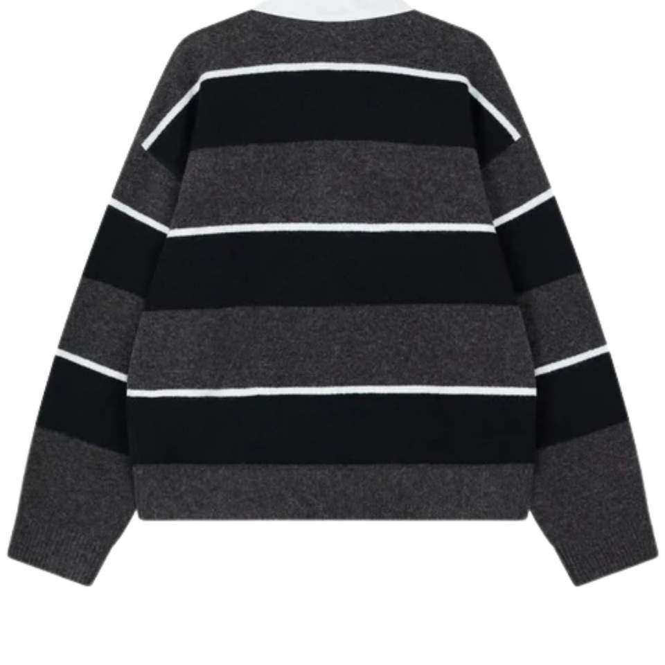 เสื้อสเวตเตอร์คอวีลายทางสำหรับผู้ชาย คอเสื้อตัดสี ชาร์โคล แขนยาว สวมใส่สบาย เหมาะสำหรับฤดูหนาว ผลิตจากผ้าฝ้ายผสมเนื้อนุ่ม รับผลิตแบบ OEM