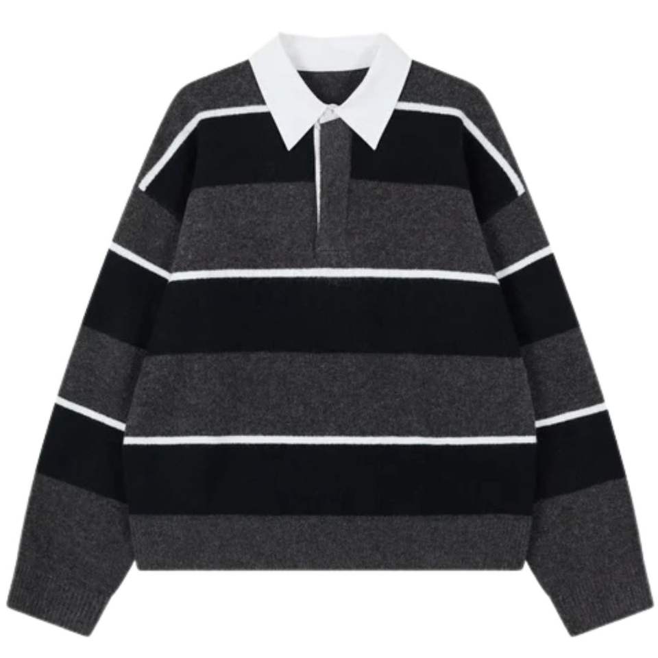 เสื้อโปโลถักลายทางผู้ชาย คอเสื้อตัดสี ชาร์โคล แขนยาว สวมใส่สบาย เหมาะสำหรับฤดูหนาว ผลิตจากผ้าฝ้ายผสมเนื้อนุ่ม รับผลิตแบบ OEM
