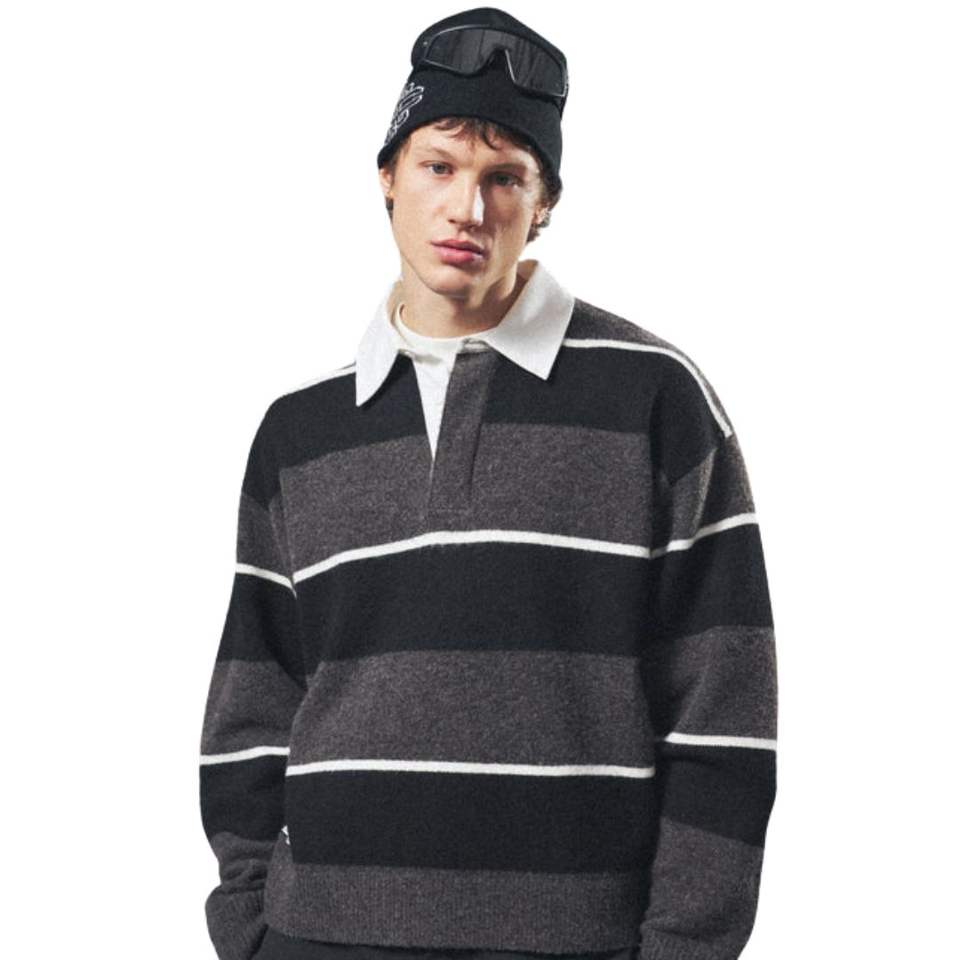 เสื้อโปโลถักลายทางผู้ชาย คอเสื้อตัดสี ชาร์โคล แขนยาว สวมใส่สบาย เหมาะสำหรับฤดูหนาว ผลิตจากผ้าฝ้ายผสมเนื้อนุ่ม รับผลิตแบบ OEM