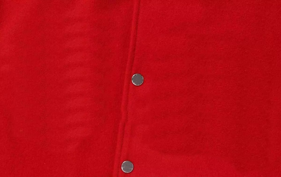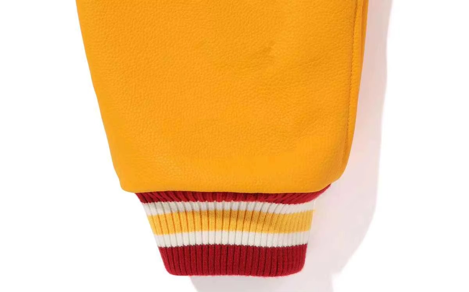 เสื้อแจ็คเก็ตเลตเตอร์แมนผู้ชายสุดเท่ ดีไซน์สีแดงและเหลืองสะดุดตา ผลิตจากผ้าโพลีเอสเตอร์ผสมฝ้าย โดดเด่นในฝูงชน เหมาะสำหรับลุคสปอร์ต