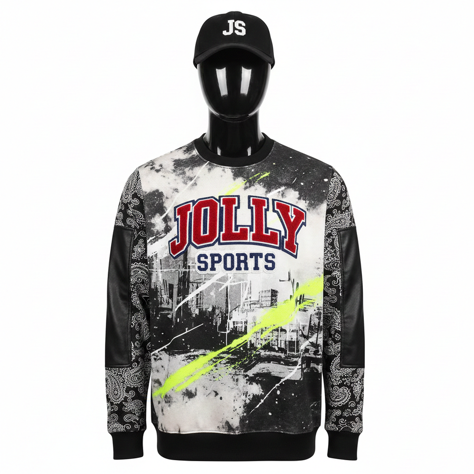 เสื้อสเวตเชิ้ตผู้ชายแบบซับลิเมชั่น ผ้าฟลีซโพลีเอสเตอร์พรีเมียม GSM พิมพ์ลายเต็มตัว สีดำ แขนเสื้อสีเทา พร้อมโลโก้สั่งทำพิเศษ เสื้อสเวตเชิ้ตพื้นฐานสำหรับผู้ชาย