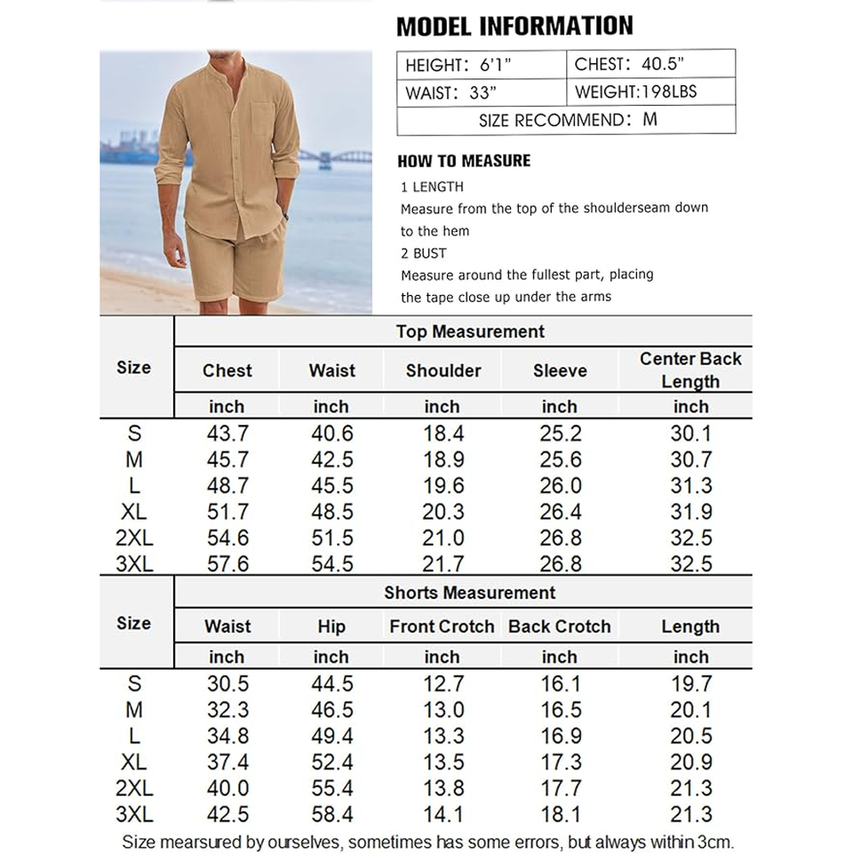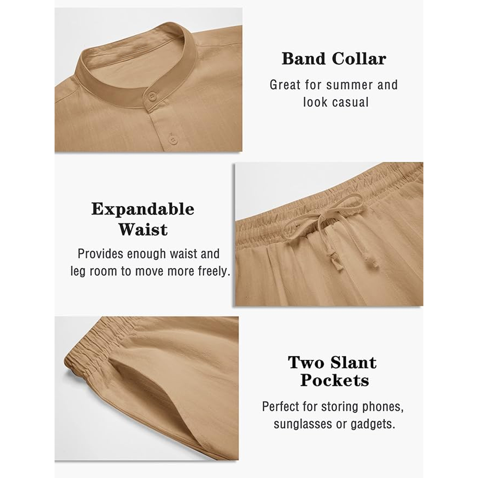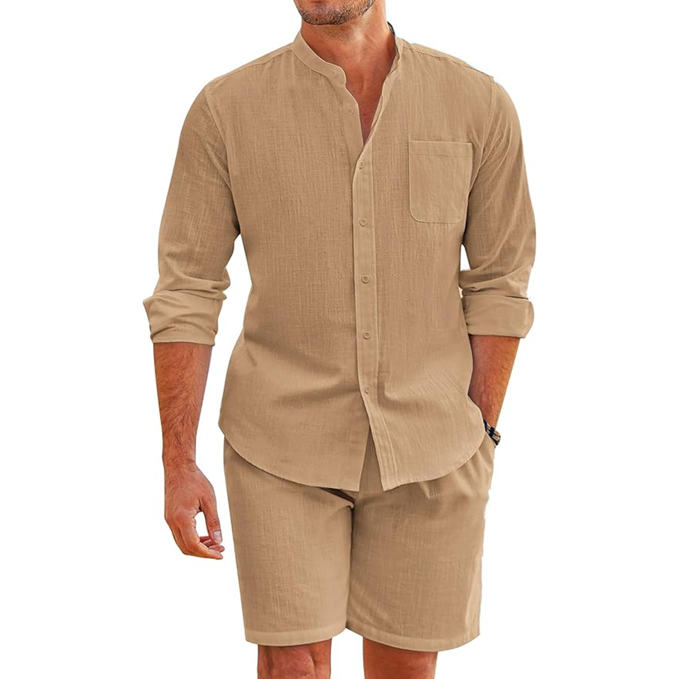 ชุดวอร์มสองชิ้นสำหรับผู้ชายเสื้อเชิ้ตคอจีนแขนยาวและกางเกงขาสั้นเอวยางยืดลำลองฤดูร้อน