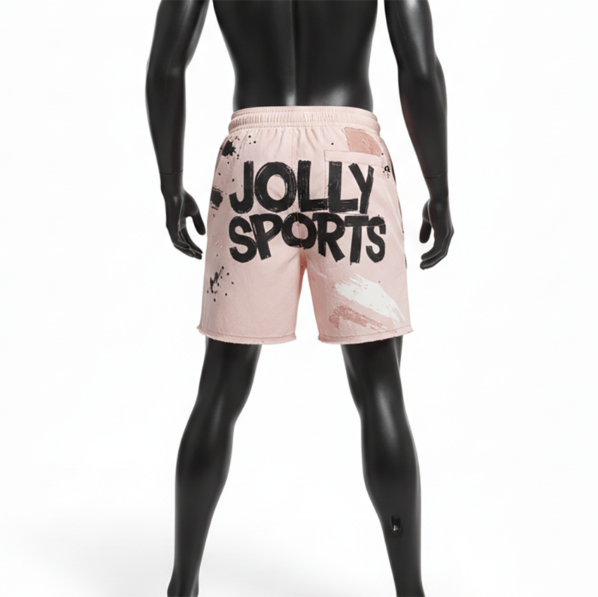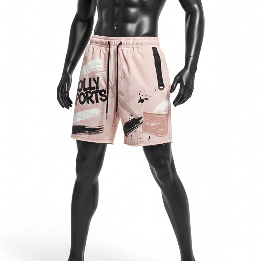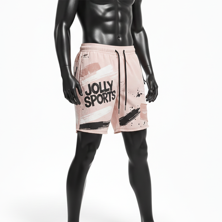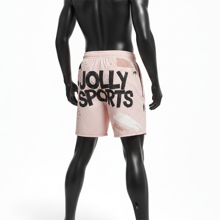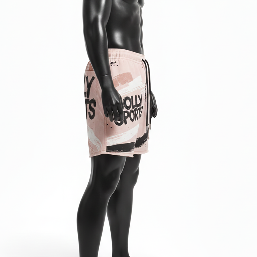 กางเกงว่ายน้ำชายคุณภาพสูง โพลีเอสเตอร์ผสมอีลาสเทน 140 GSM น้ำหนักเบา สีพีช ลายพิมพ์แบบแผง พร้อมโลโก้สั่งทำพิเศษ