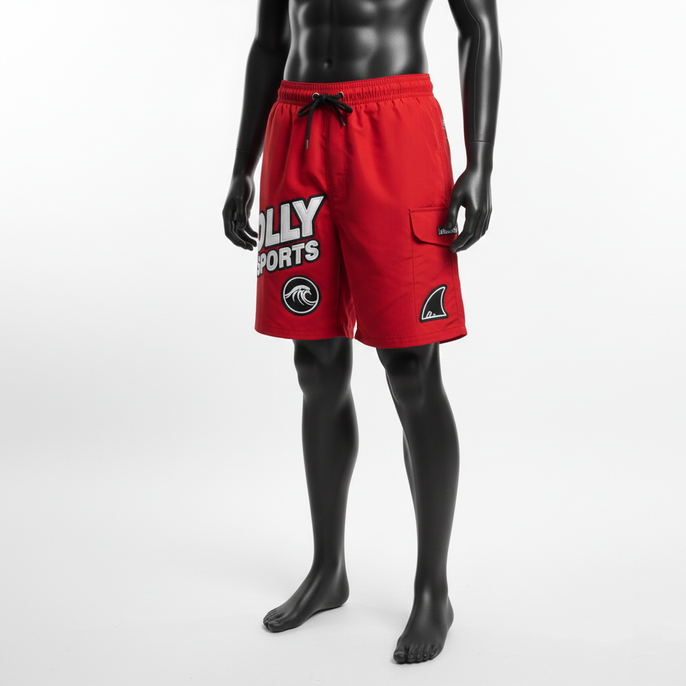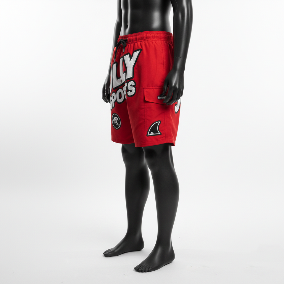 กางเกงว่ายน้ำชายพรีเมียม 120 GSM โพลีเอสเตอร์ไมโครไฟเบอร์ แห้งเร็ว สีแดงล้วน พร้อมโลโก้แบบสั่งทำด้วยเทคนิคฮีททรานเฟอร์