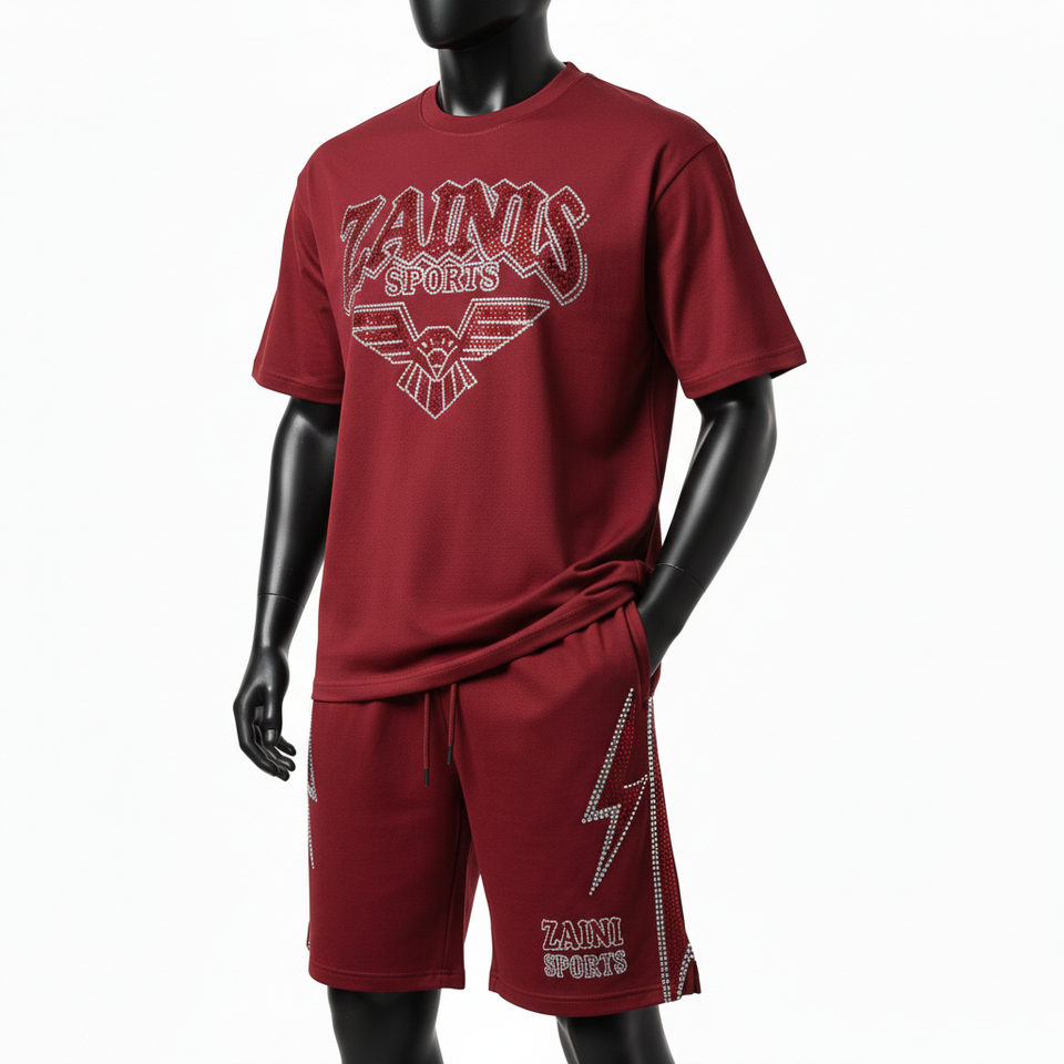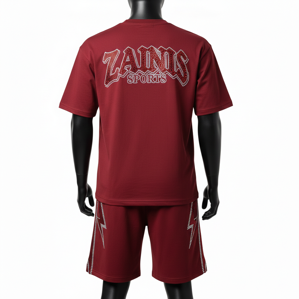 ชุดเสื้อยืดและกางเกงขาสั้นผู้ชาย ผ้าโพลีเอสเตอร์ถักคุณภาพสูง ชุดกีฬาสีพื้น โลโก้ประดับเพชร สามารถปรับแต่งได้