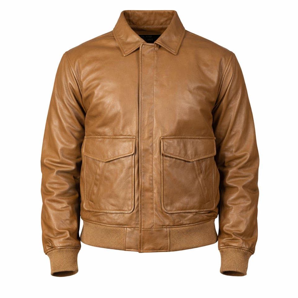 เสื้อแจ็คเก็ตหนังแท้ทรงบอมเบอร์สำหรับผู้ชาย ดีไซน์กระเป๋าแบบคลาสสิก ชายเสื้อแบบริบ ลำลอง กันน้ำ