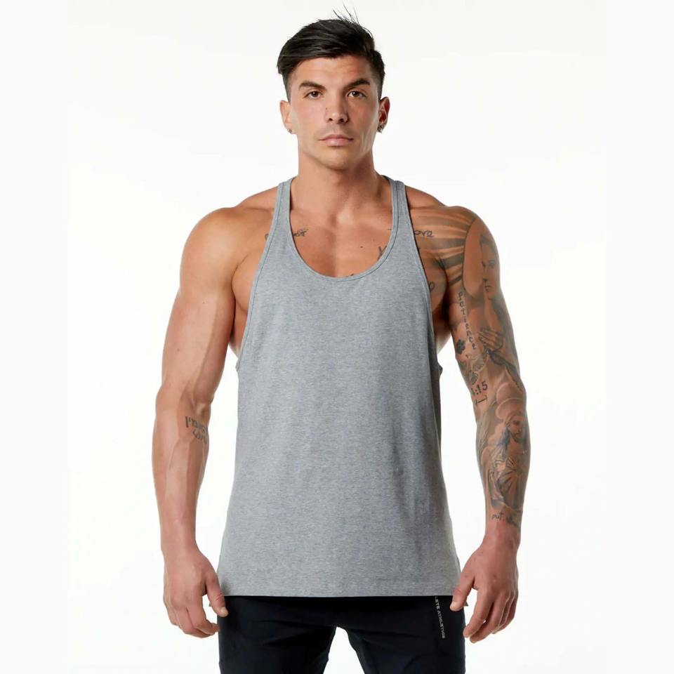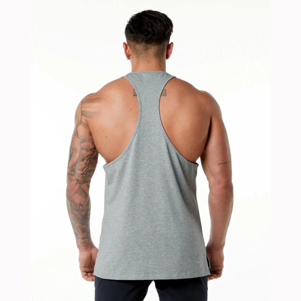 เสื้อกล้ามผู้ชายผ้าฝ้าย94% 6% สแปนเด็กซ์ใส่สบายระบายอากาศตัดต่ำคอเสื้อเปิด racerback ทุ่งหญ้าสีเทา
