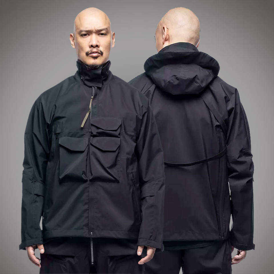 เสื้อแจ็คเก็ตเทคแวร์ผู้ชายแบบยุทธวิธี หลายกระเป๋า กันน้ำ กันลม สไตล์ไซเบอร์พังก์ สตรีทแวร์ ฟังก์ชันแนล อูร์เบิร์น มีฮู้ด เสื้อโค้ทคาร์โก้สำหรับกิจกรรมกลางแจ้ง