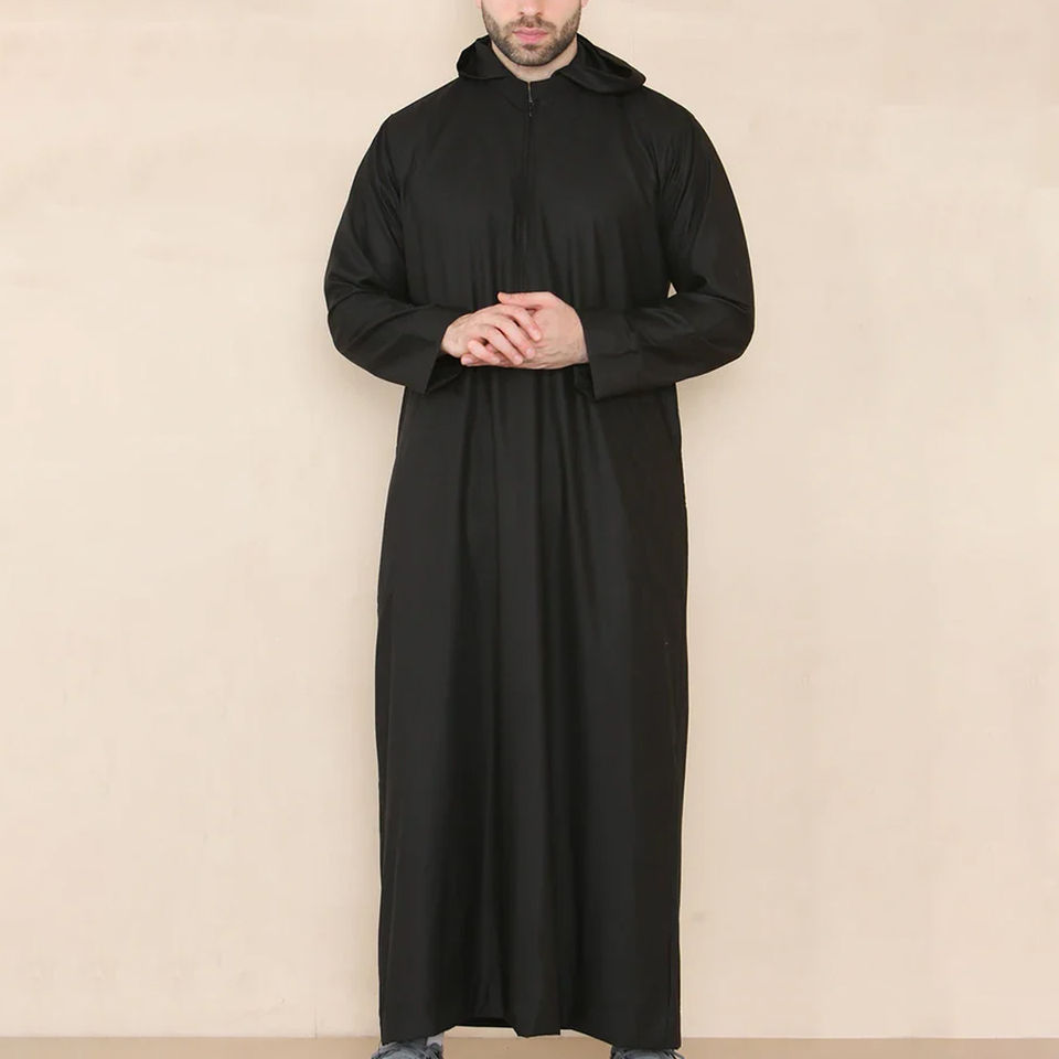 ชุดคลุมผู้ชายแบบอิสลาม สีพื้น ผ้าโพลีเอสเตอร์ คาฟตัน จุบบะห์ ชุดคลุมมีฮู้ดสำหรับผู้ชายมุสลิม