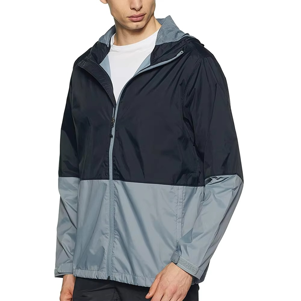เสื้อแจ็คเก็ตวินด์เบรกเกอร์ผู้ชายแบบทูโทน มีฮู้ด น้ำหนักเบา กันน้ำ เหมาะสำหรับกิจกรรมกลางแจ้ง เดินป่า ตกปลา สวมใส่สบาย มีซิป รับผลิตตามแบบ OEM