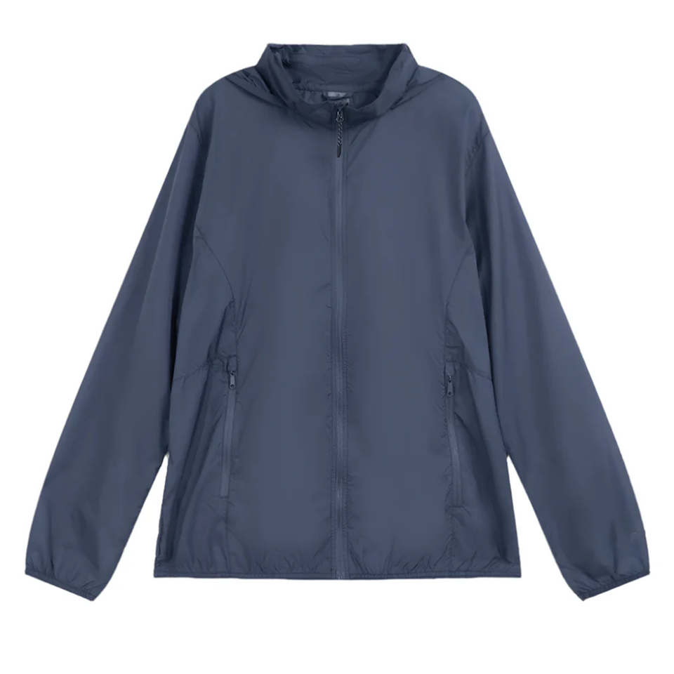 เสื้อแจ็คเก็ตวิ่งสำหรับผู้ชายไซส์ใหญ่พิเศษ กันลมอย่างดี ระบายอากาศได้ดี ซิปหน้า แขนเสื้อยืดหยุ่นได้ พับเก็บได้ สีน้ำเงิน