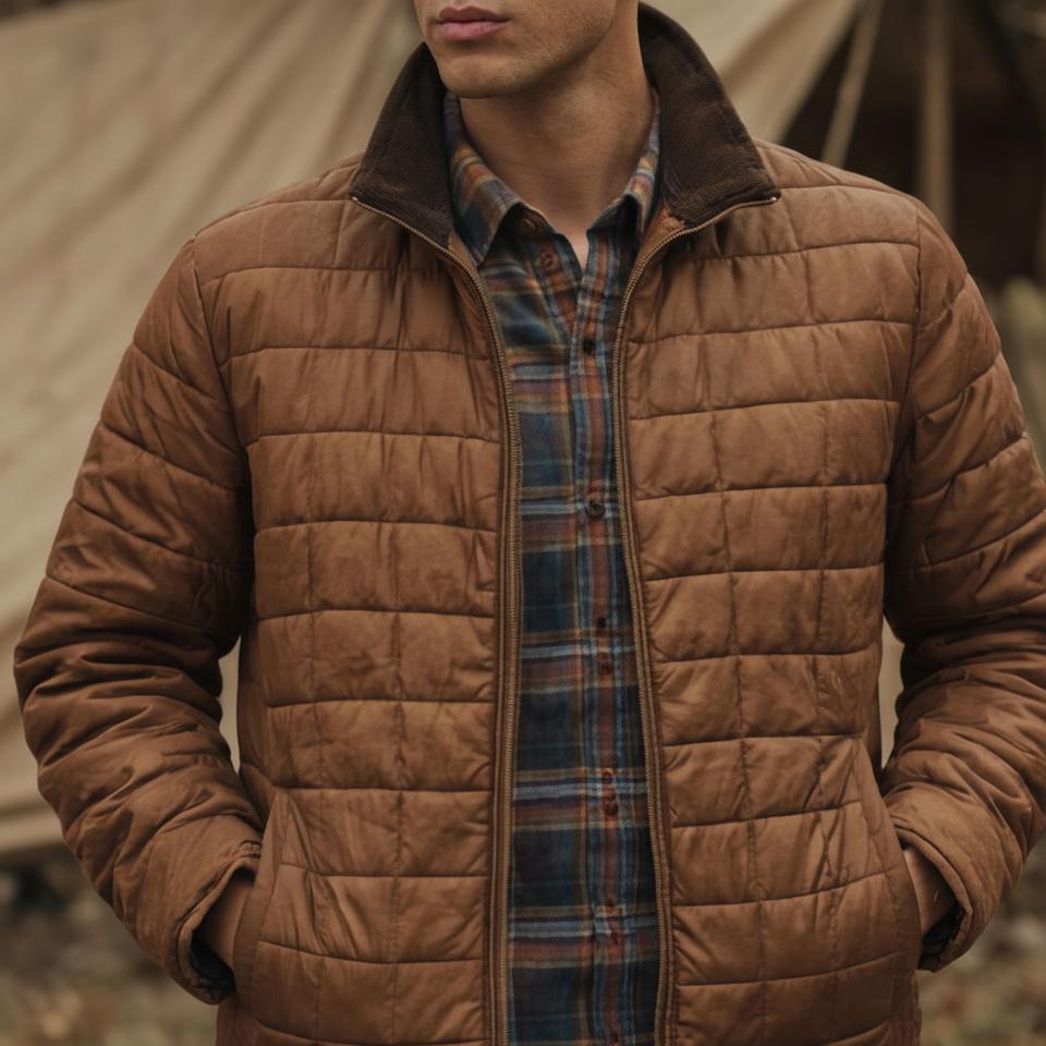 เสื้อแจ็คเก็ตผู้ชายสไตล์วินเทจสีน้ำตาล แบบควิลท์ น้ำหนักเบา แบบพัฟเฟอร์ เสื้อโค้ทฤดูหนาวสำหรับผู้ชาย ลำลอง ใส่ทำงานกลางแจ้ง ซิปด้านหน้า คอตั้ง